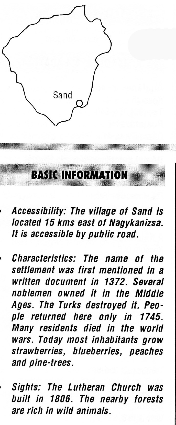 Nyilvános 2320 | 7552 | Sand | BASIC INFORMATION Accessibility: The village of Sand is located 15 kms east of Nagykanizsa. It is accessible by public road. Characteristics: The name of the settlement was first mentioned in a written document in 1372. Several noblemen owned it in the Middle Ages. The Turks destroyed it. People returned here only in 1745. Many residents died in the world wars. Today most inhabitants grow strawberries, blueberries, peaches and pine-trees. Sights: The Lutheran Church was built in 1806. The nearby forests are rich in wild animals. This text came from the following book: Title: Handbook of Zala county (Zala megye kézikönyve) Series: County handbooks of Hungary (Magyarország megyei kézikönyvei) Chief editor: Hóbor József Publisher: (Hatvan), CEBA-Hungary Ltd, 1998 ETO: 908.439.121(035) ; 050.8(439.121) ISBN: 963-9089-18-2 Pages: 488-1040 p. Remark: Closed on: 1998. márc. 31. |