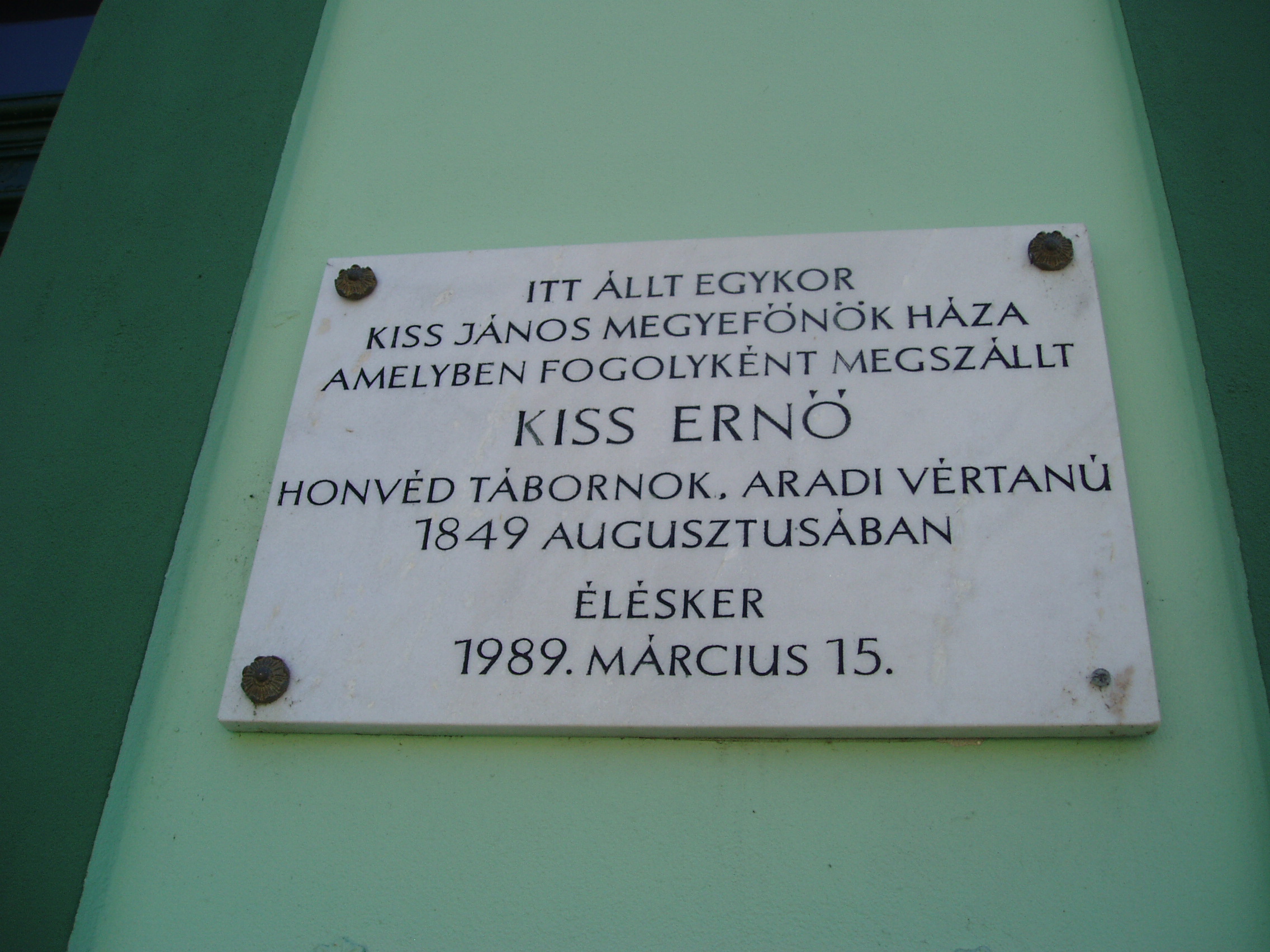Nyilvános 980 | 1475 | Gyula, Kossuth utca 13. Egykori Békésmegyei Kaszinó épülete | A szabadságharc idején ezen a helyen Kiss János későbbi megyefőnök háza állt. Nála szállt meg 1849 augusztusában rokona, Kiss Ernő honvéd tábornok. Az aradi tizenhárom között őt is kivégezték, emlékét márványtábla idézi a mostani épületen, amely 1906-ban épült Úri Kaszinónak, s a gyulai elit szórakozóhelye volt. Ma a Gyulai Várszínház igazgatósága található benne. A szabadságharc tragikus gyulai eseményét lásd: Gyula, Várkert: Honvédtiszti emlékhely. A fénykép 2007 júliusában készült. Felh. irod.: Czeglédi Imre: Gyula útikalauz. 2. jav., bőv. kiad. Gyula, 1995 |
