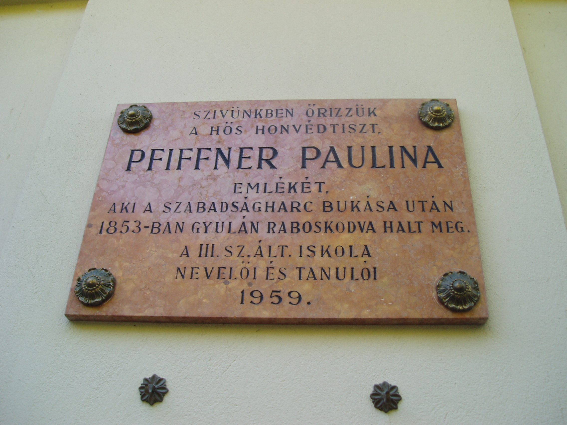 Nyilvános 971 | 1453 | Gyula, Kossuth utca 36. | Az épületben az uradalmi kulcsár lakott, majd a szabadságharc bukása után itt helyezték el az új szervezésű csendőrséget. 1853-ban itt tartották őrizetben Pfiffner Paulinát (1825-1853), egy mezőhegyesi méneskari tiszt leányát, aki férfiruhában mint honvéd hadnagy végigharcolta a szabadságharcot. A "Hős honvédleány" egy óvatlan pillanatban ebben a házban lett öngyilkos: szeptember 1-jén fegyverhez jutott és meglőtte magát. Hetekkel később, szeptember 29-én hunyt el a gyulai kórházban. Testét az egyházi tilalom miatt a temető árkában földelték el, csak 1888-ban kapott méltó síremléket közadakozásból. A fénykép 2007 júliusában készült. Felh. irod.: Czeglédi Imre: Gyula útikalauz. 2. jav., bőv. kiad. Gyula, 1995 www.bekes-archiv.hu/dokumentumok/olvasokonyv |