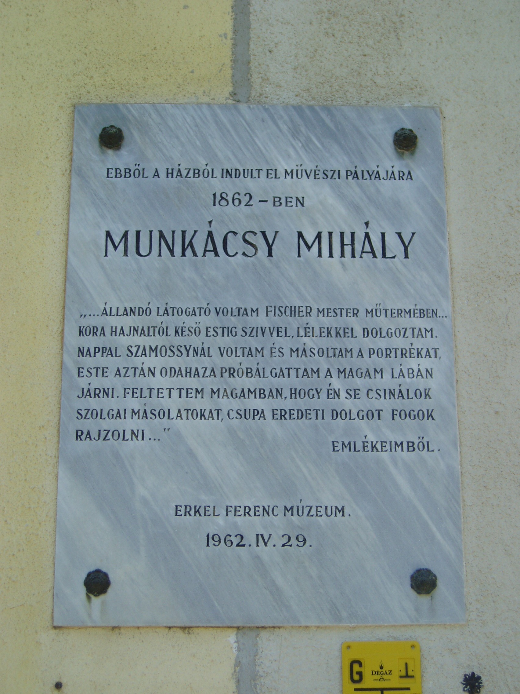 Nyilvános 992 | 1485 | Gyula, Munkácsy utca 15. | Ebben a földszintes házban - Oláh György asztalosmester egykori házában - lakott 1860-61-ben Reök István, Munkácsy Mihály nagybátyja és gyámja. A Bach-rendszer bukása után ugyanis mint régi negyvennyolcas a megyénél kapott állást, s Gyulára költözött (korábban Békéscsabán élt). Az Aradon asztaloslegényként dolgozó gyámfia, akkor még Lieb Mihály 1860 őszén őhozzá jött haza Gyulára. A sokáig váltólázban szenvedő fiút nagybátyja Karl Fischer helybeli rajztanár műtermében taníttatta, hogy az asztalosmesterséghez szükséges rajztudást elsajátítsa. S itt, Fischer mesternél látta meg őt a Wenckheim kastélyban (lásd: Gyula, Kossuth u. 15.) tartózkodó Szamossy Elek festőművész, aki felismerte Munkácsy tehetségét, magához vette, s Gyuláról távozván, a nagybácsi engedélyével magával is vitte. Így mentette meg a tehetséges fiút a magyar művészet számára. Munkácsy maga is azt vallja önéletírásában, hogy élete sorsa Gyulán dőlt el. A ház falán márványtábla őrzi Munkácsy emlékét, s ezen idézetet olvashatunk Munkácsy "Emlékeimből" című önéletrajzából. A fénykép 2007 júliusában készült. Felh. irod.: Czeglédi Imre: Gyula útikalauz. 2. jav., bőv. kiad. Gyula, 1995 |