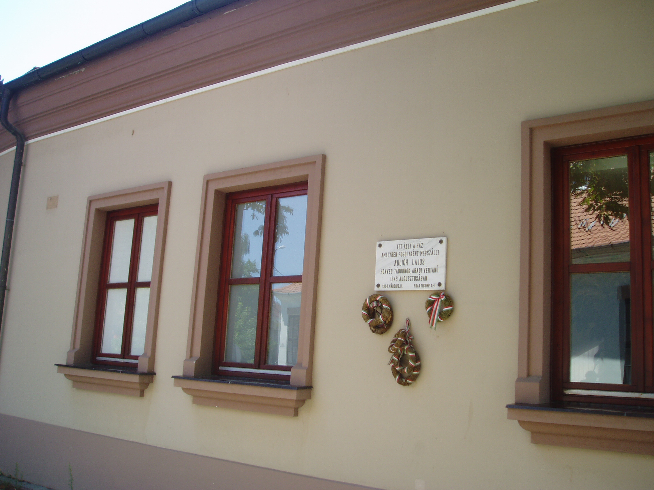 Nyilvános 975 | 1447 | Gyula, Városház utca 23. | A lakóházat 1994-ben eredeti formájában építették újjá. 1849 augusztusában itt szállt meg Aulich Lajos honvéd tábornok. A szabadságharc tragikus gyulai eseményét lásd: Gyula, Várkert: Honvédtiszti emlékhely. A fénykép 2007 júliusában készült. Felh. irod.: Czeglédi Imre: Gyula útikalauz. 2. jav., bőv. kiad. Gyula, 1995 |