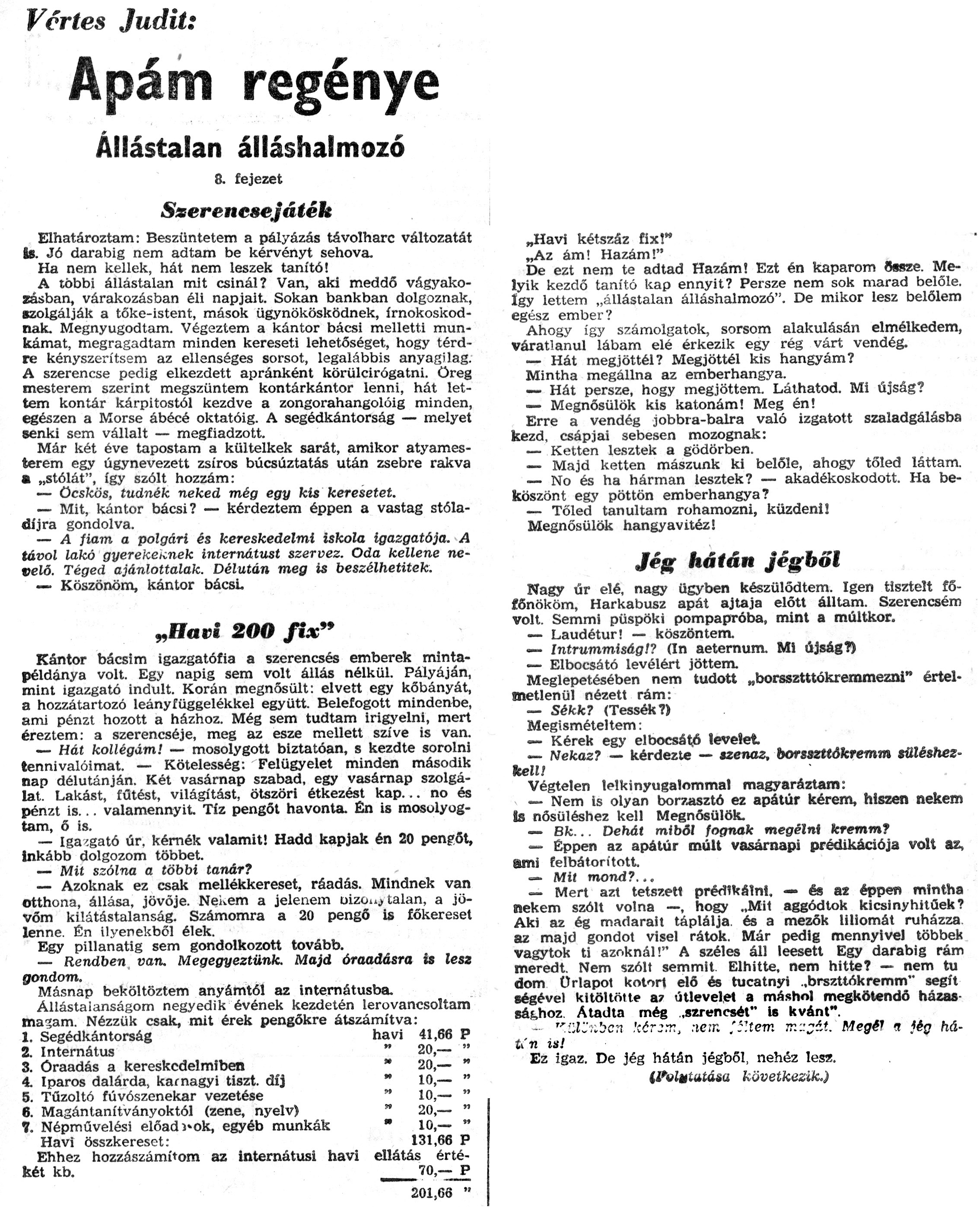 Nyilvános 1104 | 2122 | Zalai Hírlap 1971.02.21. 044sz 08old - Apám regénye 08 | A következő szöveg a cikkből keletkezett automata szövegfelismertető segítségével: Vertes Judit: Apám regénye Állástalan álláshalmozó 8. fejezet Szerencsejáték Elhatároztam: Beszüntetem a pályázás távolharc változatát is. Jó darabig nem adtam be kérvényt sehova. Ha nem kellek, hát nem leszek tanító! A többi állástalan mit csinál? Van, aki meddő vágyakozásban, várakozásban éli napjait. Sokan bankban dolgoznak, szolgálják a tőke-istent, mások ügynökösködnek, írnokoskod-nak. Megnyugodtam. Végeztem a kántor bácsi melletti munkámat, megragadtam minden kereseti lehetőséget, hogy térdre kényszerítsem az ellenséges sorsot, legalábbis anyagilag. A szerencse pedig elkezdett apránként körülcirógatni. öreg mesterem szerint megszűntem kontárkántor lenni, hát lettem kontár kárpitostól kezdve a zongorahangolóig minden, egészen a Morse ábécé oktatóig. A segédkántorság — melyet senki sem vállalt — megfiadzott. Már két éve tapostam a kültelkek sarát, amikor atyamesterem egy úgynevezett zsíros búcsúztatás után zsebre rakva a „stólát", így szólt hozzám: — Öcskös, tudnék neked még egy kis keresetet. — Mit, kántor bácsi? — kérdeztem éppen a vastag stóla-díjra gondolva. — A fiam a polgári és kereskedelmi iskola igazgatója. A távol lakó gyerekéinek internátust szervez. Oda kellene nevelő. Téged ajánlottalak. Délután meg is beszélhetitek. — Köszönöm, kántor bácsi. „Havi 200 fix" Kántor bácsim igazgatófia a szerencsés emberek mintapéldánya volt. Egy napig sem volt állás nélkül. Pályáján, mint igazgató indult. Korán megnősült: elvett egy kőbányát, a hozzátartozó leányfüggelékkel együtt. Belefogott mindenbe, ami pénzt hozott a házhoz. Még sem tudtam irigyelni, mert éreztem: a szerencséje, meg az esze mellett szíve is van. — Hát kollégám! — mosolygott biztatóan, s kezdte sorolni tennivalóimat. — Kötelesség: Felügyelet minden második nap délutánján. Két vasárnap szabad, egy vasárnap szolgálat. Lakást, fűtést, világítást, ötszöri étkezést kap... no és pénzt is... valamennyit Tíz pengőt havonta. Én is mosolyogtam, ő is. — Igazgató úr, kérnék valamit! Hadd kapjak én 20 pengőt, inkább dolgozom többet. — Mit szólna a többi tanár? — Azoknak ez csak mellékkereset, ráadás. Mindnek van otthona, állása, jövője. Nekem a jelenem üizoi»> talán, a jö-vőm kilátástalanság. Számomra a 20 pengő is főkereset lenne. Én ilyenekből élek. Egy pillanatig sem gondolkozott tovább. — Rendben van. Megegyeztünk. Majd óraadásra is lesz gondom. Másnap beköltöztem anyámtól az internátusba. Állástalanságom negyedik évének kezdetén lerovancsoltam ma?am. Nézzük csak, mit érek pengőkre átszámítva: 1. Segédkán torság havi 41,66 P 2. Internátus " 20,— " 3. Óraadás a kereskedelmiben " 20,— " 4. Iparos dalárda, karnagyi tiszt, díj " 10,— " 5. Tűzoltó fúvószenekar vezetése " 10,— " 6. Magántanítványoktól (zene, nyelv) " 20,— " 7. Népművelési előad )-ok, egyéb munkák " 10,— " Havi összkereset: 131,66 P Ehhez hozzászámítom az internátusi havi ellátás értékét kb. 70,— P \'\'\' 201,63 " „Havi kétszáz fix!" „Az ám! Hazám!" De ezt nem te adtad Hazám! Ezt én kaparom Sssze. Melyik kezdő tanító kap ennyit? Persze nem sok marad belőle. Így lettem „állástalan álláshalmozó". De mikor lesz belőlem egész ember? Ahogy így számolgatok, sorsom alakulásán elmélkedem, Váratlanul lábam elé érkezik egy rég várt vendég. — Hát megjöttél? Megjöttél kis hangyám? Mintha megállna az emberhangya. — Hát persze, hogy megjöttem. Láthatod. Mi újság? — Megnősülök kis katonám! Meg én! Erre a vendég jobbra-balra való izgatott szaladgálásba kezd, csápjai sebesen mozognak: — Ketten lesztek a gödörben. — Majd ketten mászunk ki belőle, ahogy tőled láttam. — No és ha hárman lesztek? — akadékoskodott. Ha beköszönt egy pöttön emberhangya? — Tőled tanultam rohamozni, küzdeni! Megnősülök hangyavitéz! - Jég hátán jégből Nagy úr elé, nagy ügyben készülődtem. Igen tisztelt fő-főnököm, Harkabusz apát ajtaja előtt álltam. Szerencsém volt. Semmi püspöki pompapróba, mint a múltkor. — Laudétur! — köszöntem. — Intrummiság!? (In aeternum. Mi újság?) — Elbocsátó levélért jöttem. Meglepetésében nem tudott „borssztttókrernmezni" értelmetlenül nézett rám: — Séfcfc? (Tessék?) Megismételtem: — Kérek egy elboesátő levelet — Nekaz? — kérdezte — szenaz, borsszttökremm sütéshez-kell! Végtelen lelkinyugalommal magyaráztam: > — Nem is olyan borzasztó ez apátúr kérem, hiszen nekem Is nősüléshez kell Megnősülök. — Bk... Dehát miből fognak megélni kremm? — Éppen az apátúr múlt vasárnapi prédikációja volt az, ami felbátorított — Mit mond?... — Mert azt tetszeti prédikálni, — és 82 éppen mintha nekem szólt volna —, hogy „Mit aggódtok kicsinyhitűek? Aki az ég madarait táplálja, és a mezők liliomát ruházza. az majd gondot visel rátok. Már pedig mennyivel többek vagytok ti azoknál!" A széles áll leesett Egy darabig rám meredt. Nem szólt semmit. Elhitte, nem hitte? — nem tu dom Űrlapot kotort elő és tucatnyi ..brszttókremnV segít ségével kitöltötte az útlevelet a máshol megkötendő házassághoz. Átadta még „szreneset" is kvánt". - "::i:-;.bc:i kir:T., :iem ,\'í\'tem ir.::-áí. Megél <i )ég háti n is! Ez igaz. De jég hátán jégből, nehéz lesz. következik.) |