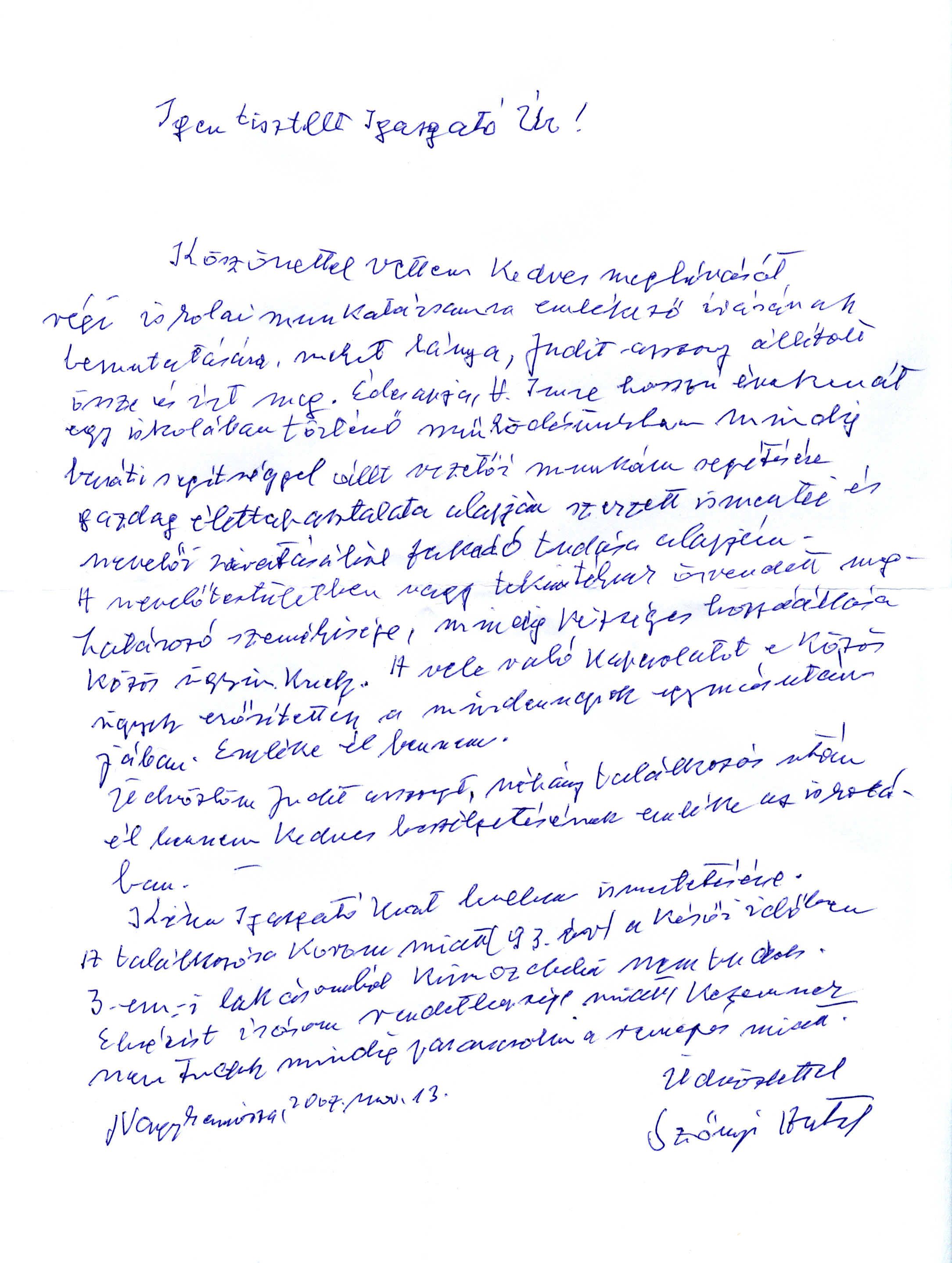 Nyilvános 1127 | 2114 | Szőnyi Antal levele Vértes Imre estjére | Igen tisztelt Igazgató Úr! Köszönettel vettem kedves meghívását régi iskolai munkatársamra emlékeztető írásának bemutatására, melyet lánya, Judit asszony állított össze és írt meg. Édesapja, Vértes Imre hosszú éveken át egy iskolában történő működésünkben mindig baráti segítséggel állt vezetői munkám segítésére gazdag élettapasztalata alapján szerzett ismeretei és nevelői hivatásából fakadó tudása alapján. A nevelőtestületben nagy tekintélynek örvendett meghatározó személyisége, mindig készséges hozzáállása közös ügyeinkhez. A vele való kapcsolatot e közös ügyek erősítették a mindennapok egymásutánjában. Emléke él bennem. Üdvözlöm Judit asszonyt, néhány találkozás után él bennem kedves beszélgetésének emléke az iskolában. Kérem Igazgató Urat levelem ismertetésére. A találkozóra korom miatt (93 év) a késői időben 3. emeleti lakásomból kimozdulni nem tudok. Elnézést írásom rendetlensége miatt, kezemnek nem tudok mindig parancsolni a remegés miatt. Nagykanizsa, 2007. nov. 13. Üdvözlettel: Szőnyi Antal |