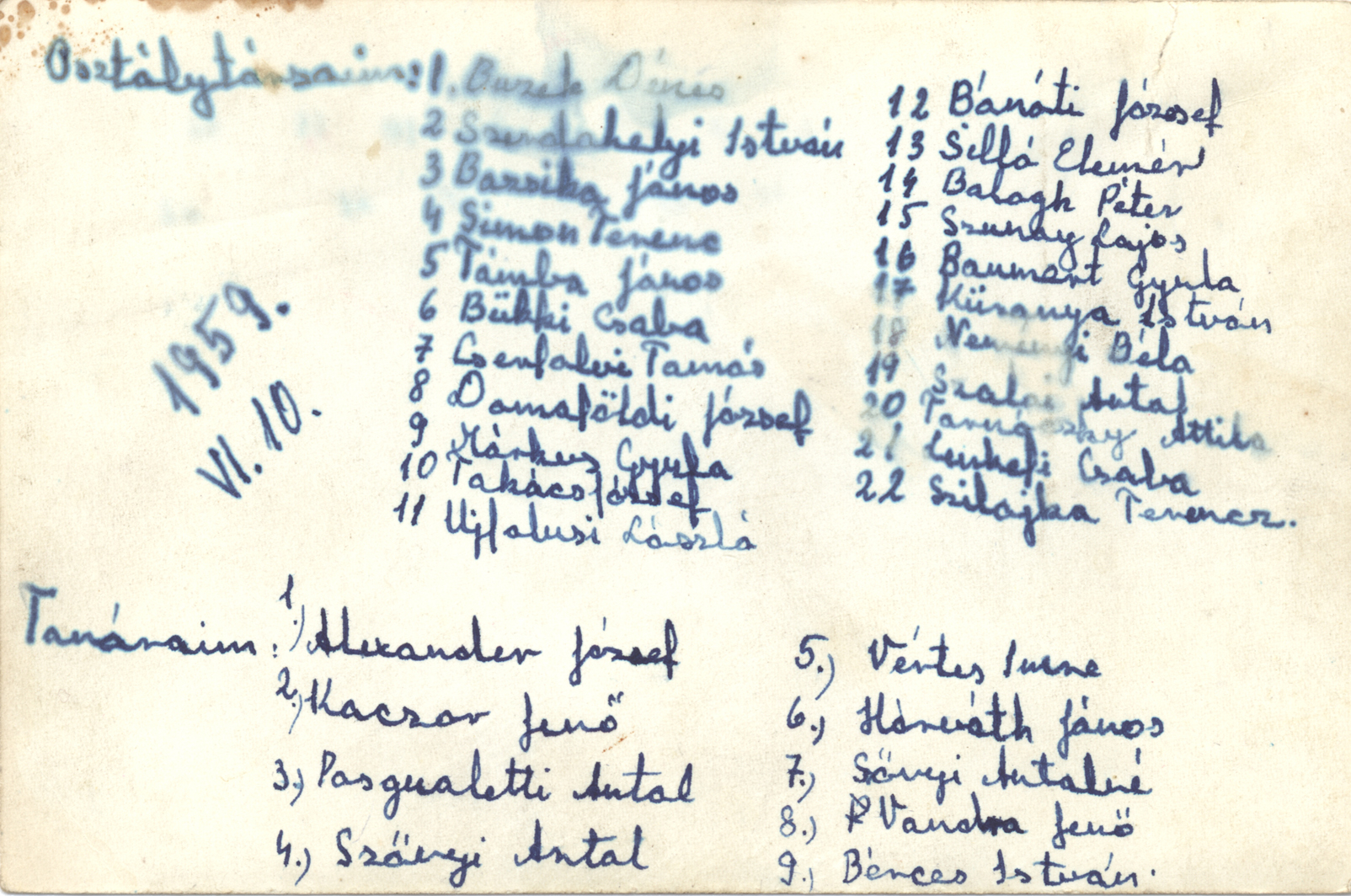 Vértes Imre osztálya 1959-ből. A fénykép hátlapja.