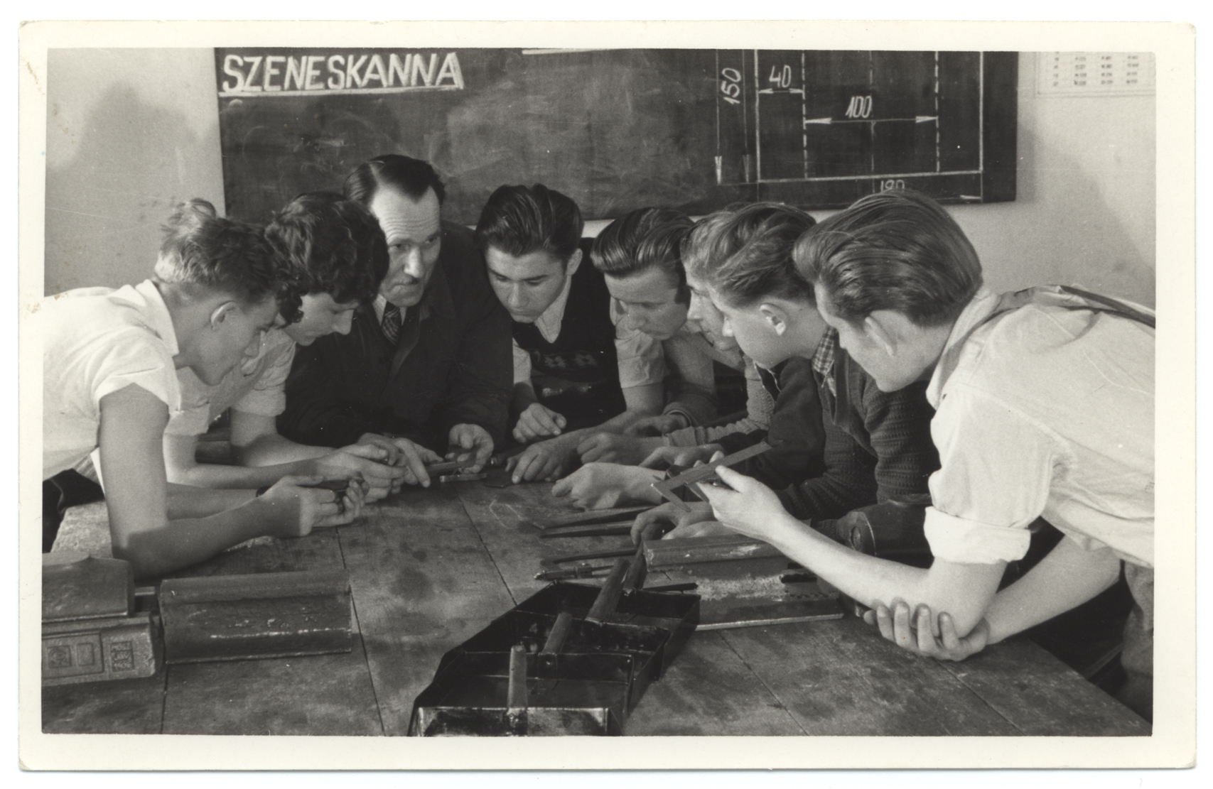 A szeneskanna tervrajza és munkamegbeszélés a diákokkal. Középen Vértes Imre tanár úr