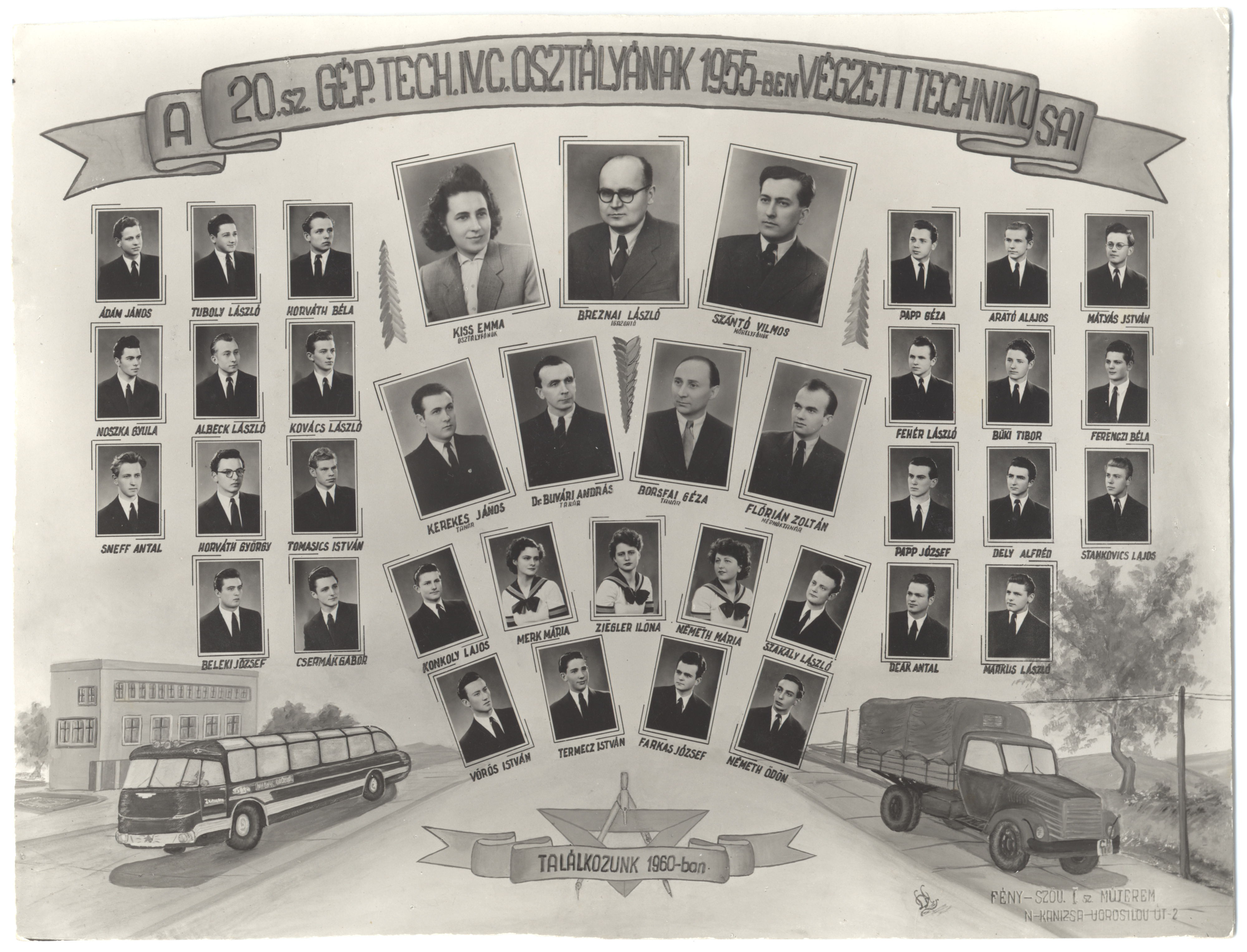 Nyilvános 1308 | 2641 | A 20.sz. Gép. Tech. IV. C. osztályának 1955-ben végzett technikusai | Borsfai Géza tanár Breznai László igazgató Buvári András dr. tanár Flórián Zoltán mérnöktanár Kerekes János tanár Kiss Emma osztályfőnök Szántó Vilmos műhelyfőnök Ádám János Albeck László Arató Alajos Beleki József Büki Tibor Csermák Gábor Deák Antal Dely Alfréd Farkas József Fehér László Ferenczi Béla Horváth Béla Horváth György Konkoly Lajos Kovács László Márkus László Mátyás István Merk Mária Németh Mária Németh Ödön Noszka Gyula Papp Géza Papp József Sneff Antal Stankovics Lajos Szakály László Termecz István Tomasics István Tuboly László Vörös István Ziegler Ilona |