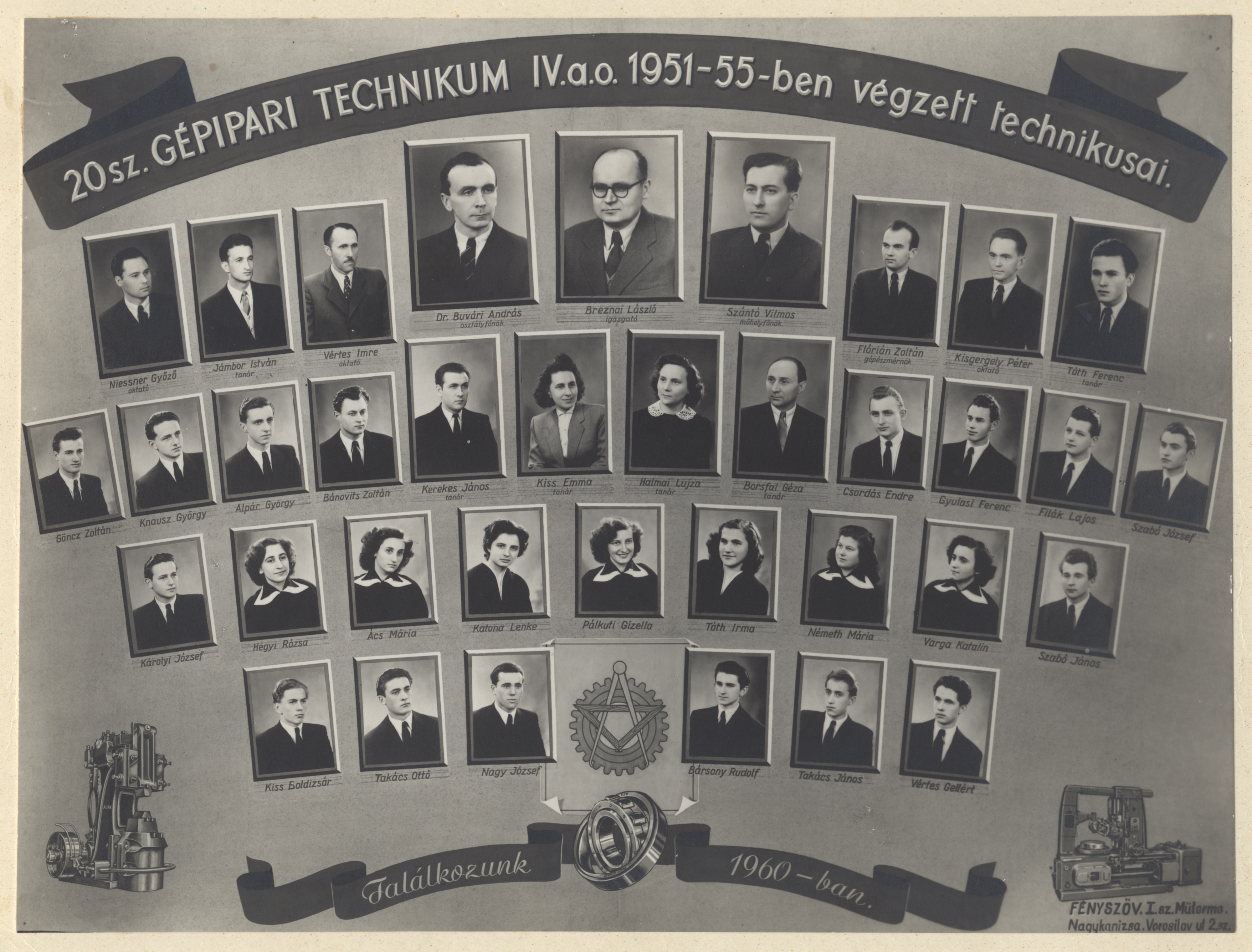 Nyilvános 1269 | 2415 | 20 sz. Gépipari Technikum IV.a.o. 1951-55-ben végzett technikusai | Borsfai Géza tanár Breznai László igazgató Buvári András dr. osztályfőnök Flórián Zoltán gépészmérnök Halmai Lujza tanár Jámbor István tanár Kerekes János tanár Kisgergely Péter oktató Kiss Emma tanár Niessner Győző oktató Szántó Vilmos műhelyfőnök Tóth Ferenc tanár Vértes Imre oktató Ács Mária Alpár György Bánovits Zoltán Bársony Rudolf Csordás Endre Filák Lajos Göncz Zoltán Gyulasi Ferenc Hegyi Rózsa Károlyi József Katona Lenke Kiss Boldizsár Knausz György Nagy József Németh Mária Pálkuti Gizella Szabó János Szabó József Takács János Takács Ottó Tóth Irma Varga Katalin Vértes Gellért |