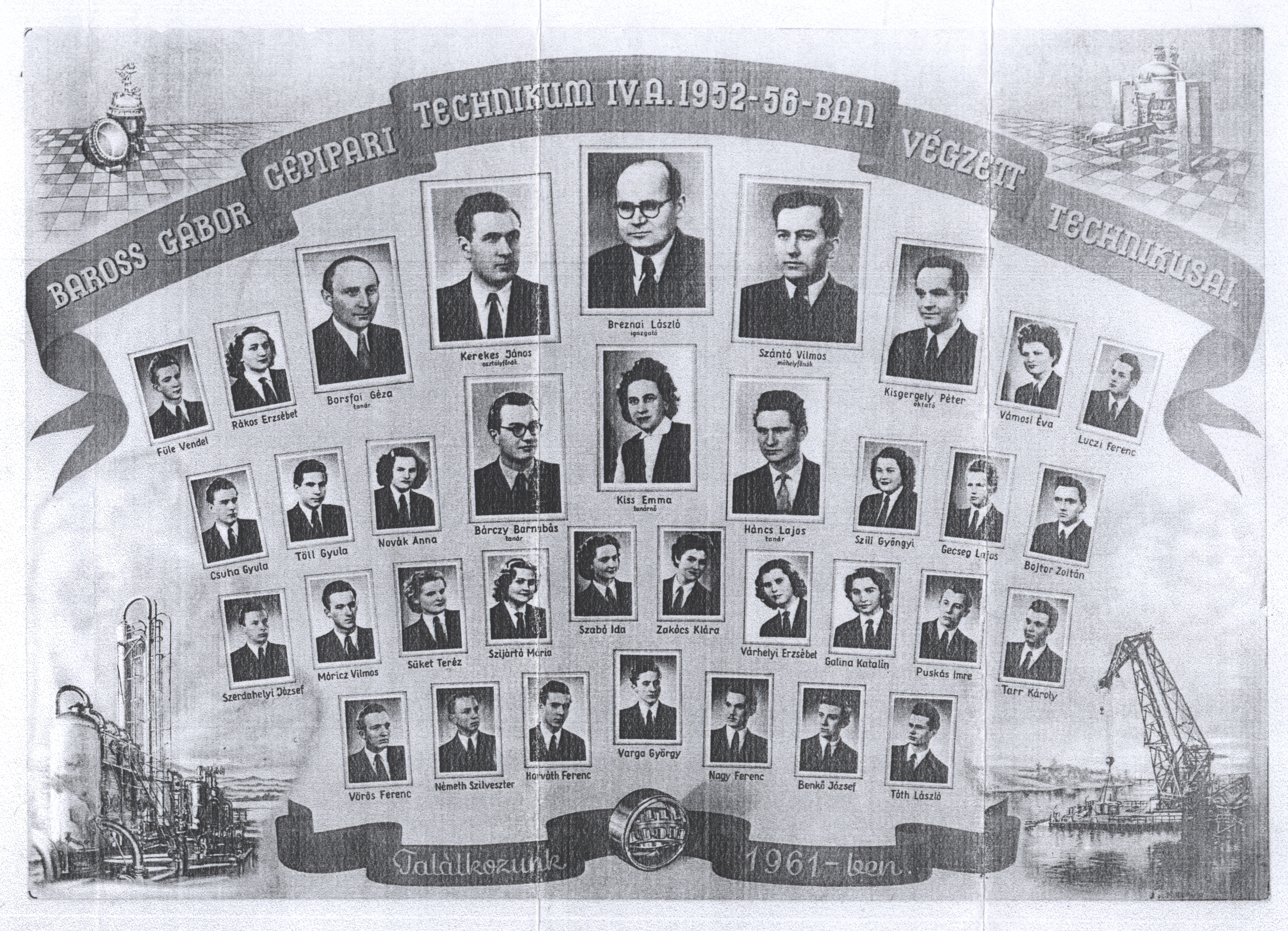 Nyilvános 1351 | 2491 | Baross Gábor Gépipari Technikum IV.A. 1952-56-ban végzett technikusai | Bárczy Barnabás tanár Borsfai Géza tanár Breznai László igazgató Háncs Lajos tanár Kerekes János osztályfőnök Kisgergely Péter oktató Kiss Emma tanárnő Szántó Vilmos műhelyfőnök Benkő József Bojtor Zoltán Csuha Gyula Füle Vendel Galina Katalin Gecseg Lajos Horváth Ferenc Luczi Ferenc Móricz Vilmos Nagy Ferenc Németh Szilveszter Novák Anna Puskás Imre Rákos Erzsébet Süket Teréz Szabó Ida Szerdahelyi József Szijártó Mária Szili Gyöngyi Tarr Károly Tóth László Töll Gyula Vámosi Éva Varga György Várhelyi Erzsébet Vörös Ferenc Zakócs Klára |