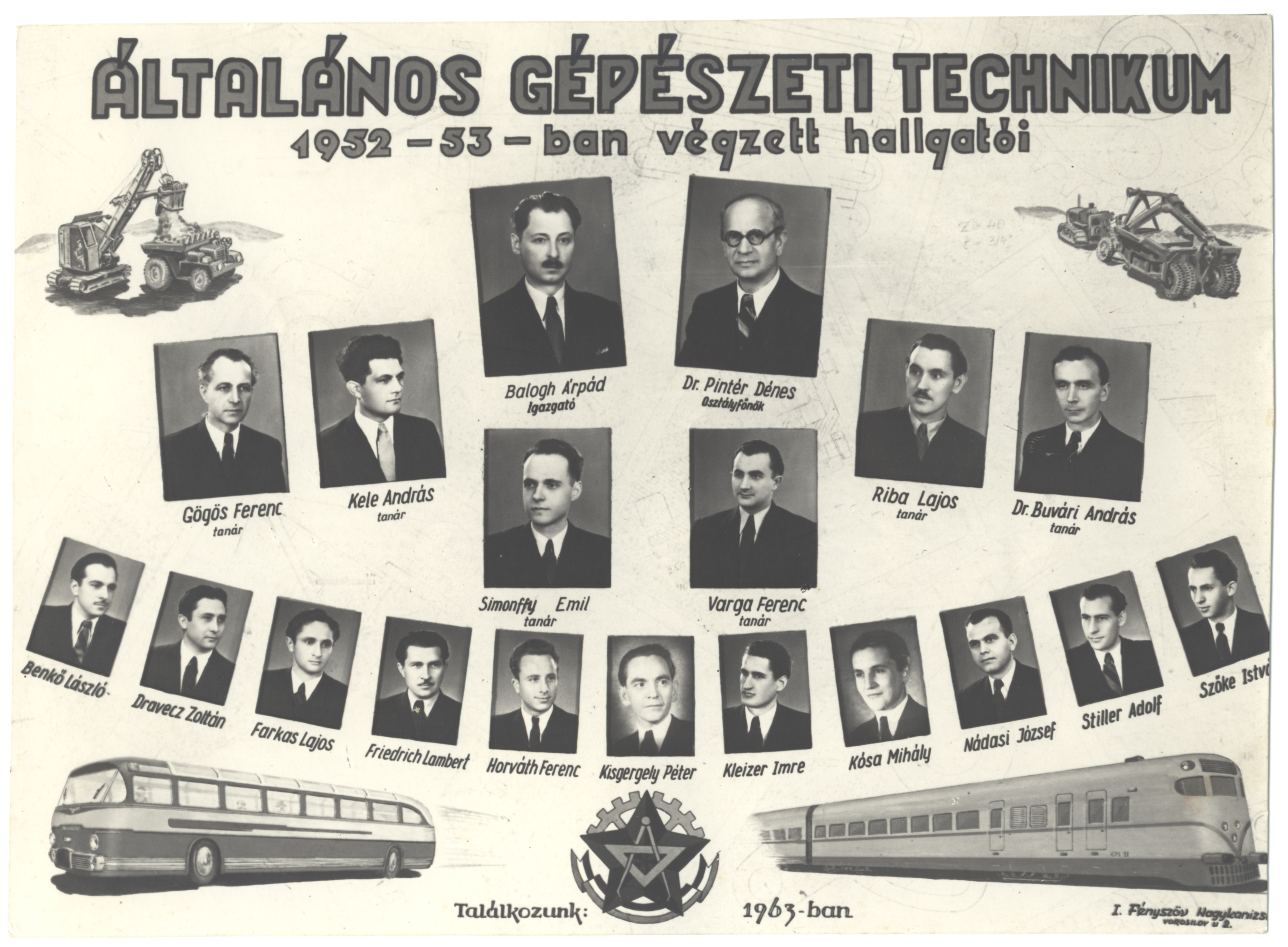 Nyilvános 1401 | 2951 | Általános Gépészeti Technikum 1952-53-ban végzett hallgatói | Balogh Árpád igazgató Buvári András dr. tanár Gögös Ferenc tanár Kele András tanár Pintér Dénes dr. osztályfőnök Riba Lajos tanár Simonffy Emil tanár Varga Ferenc tanár Benkő László Dravecz Zoltán Farkas Lajos Friedrich Lambert Horváth Ferenc Kisgergely Péter Kleizer Imre Kósa Mihály Nádasi József Stiller Adolf Szőke István |
