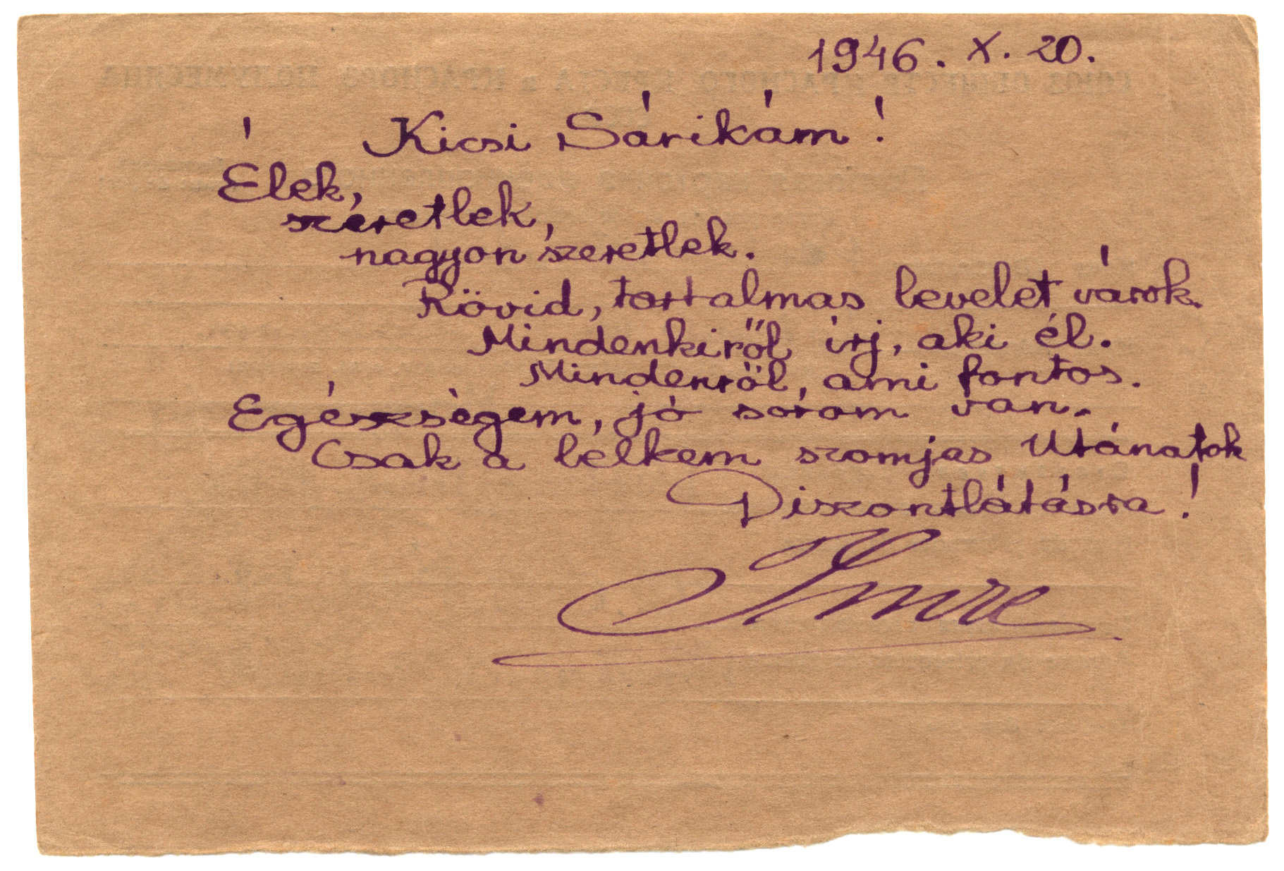 Nyilvános 1255 | 2345 | Vértes Imréné | Letenye IV. Zala vm. Magyarország Vértes Imre hdgy. C.C.C.P. Moszkva Vöröskereszt, Postafiók 430/1. c. 1946.X.20. Kicsi Sárikám! Élek, szeretlek, nagyon szeretlek. Rövid, tartalmas levelet várok. Mindenkiről írj, aki él. Mindenről, ami fontos. Egészségem, jó sorom van. Csak a lelkem szomjas utánatok. Viszontlátásra! Imre |