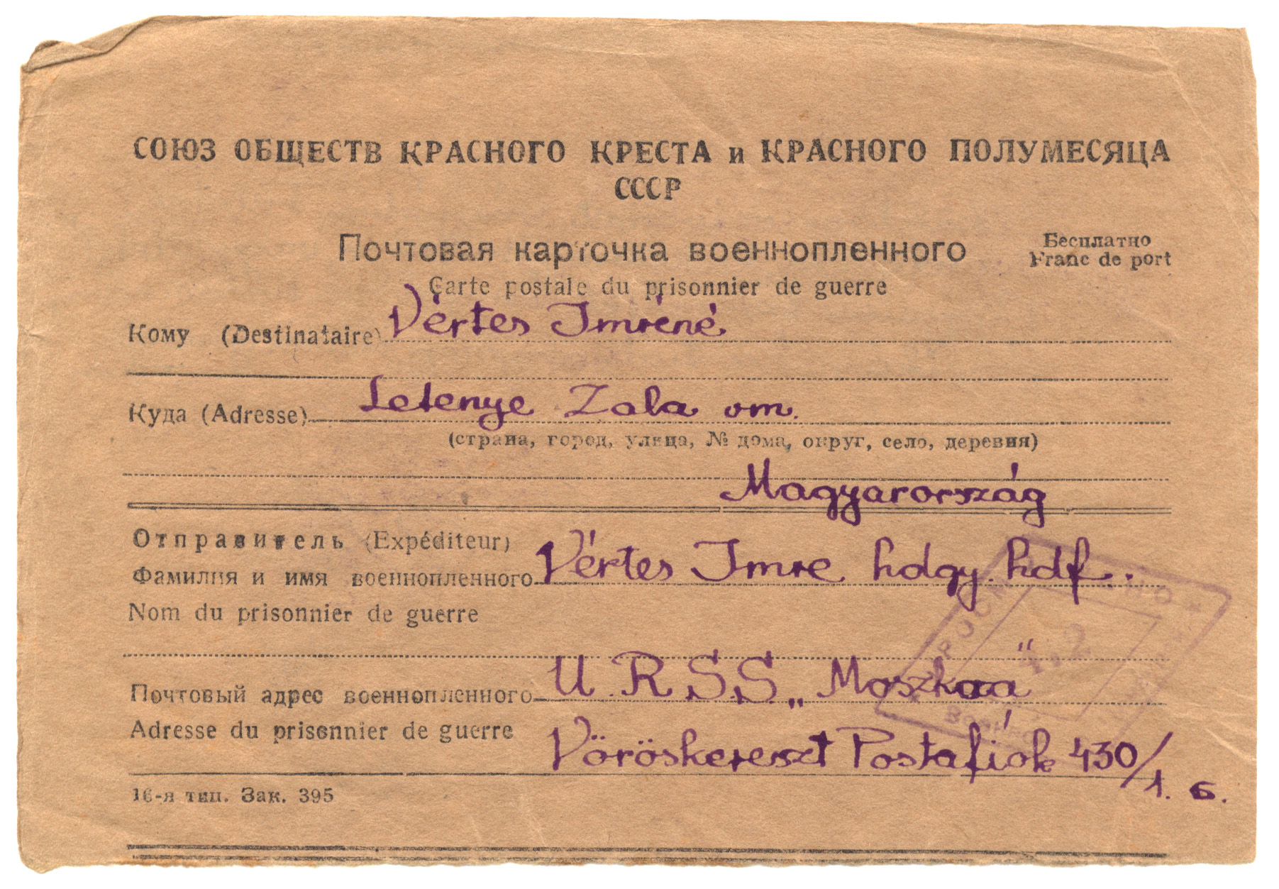 Nyilvános 1223 | 2312 | Vértes Imréné | Letenye Zala vm. Magyarország Vértes Imre hdgy. hdf. C.C.C.P. "Moszkva" Vöröskereszt, Postafiók 430/1. c. 1946. november 1. Elküldöm szívemet vágyódva Felétek. Kérdezem, kutatom: "Haltok-e, vagy éltek?" Vágyaim keresztjét könnyebben hordoznám, Sárikám, ha tudnám, hogy élsz és gondolsz rám. Imre |