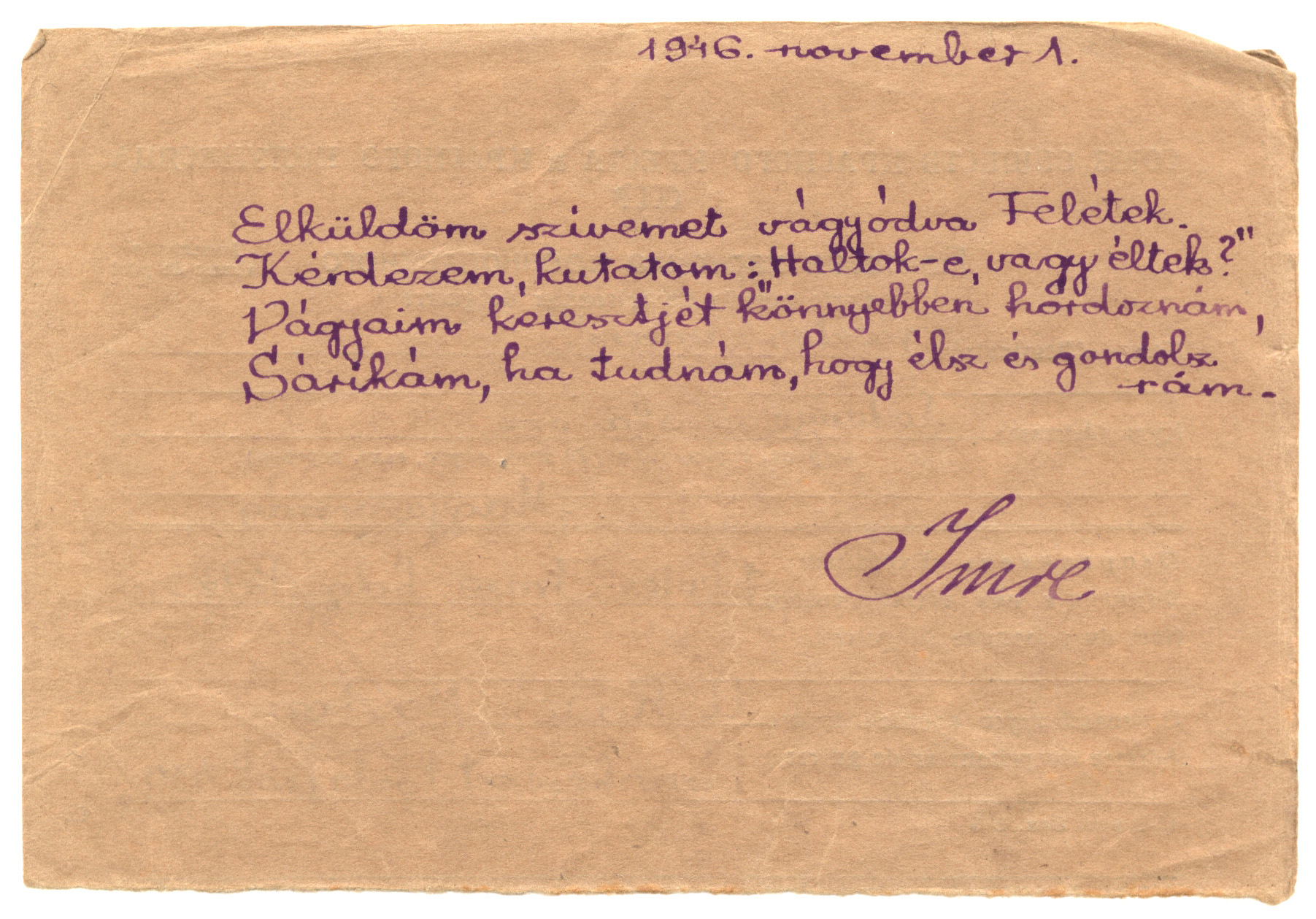 Nyilvános 1285 | 2411 | Vértes Imréné | Letenye Zala vm. Magyarország Vértes Imre hdgy. hdf. C.C.C.P. "Moszkva" Vöröskereszt, Postafiók 430/1. c. 1946. november 1. Elküldöm szívemet vágyódva Felétek. Kérdezem, kutatom: "Haltok-e, vagy éltek?" Vágyaim keresztjét könnyebben hordoznám, Sárikám, ha tudnám, hogy élsz és gondolsz rám. Imre |