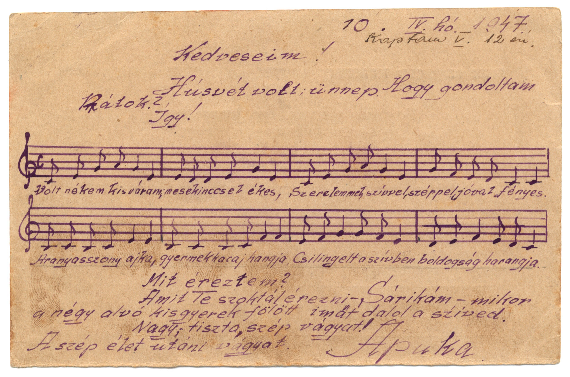 Nyilvános 1240 | 2195 | Vértes Imréné | Letenye IV. - Zala vm. Magyarország Vértes Imre hdgy. C.C.C.P. "Moszkva" Vöröskereszt, Postafiók 430/1. c. 10. IV. hó 1947. (Kaptam V. 12-én) Kedveseim! Húsvét volt, ünnep. Hogy gondoltam Rátok? Így! Volt nékem kis váram, mesekinccsel ékes, Szerelemmel, szívvel, széppel, jóval fényes. Aranyasszony ajka, gyermekkacaj hangja Csilingelt a szívben boldogság harangja. Mit éreztem? Amit Te szoktál érezni-, Sárikám - mikor a négy alvó kisgyerek fölött imát dalol a szíved. Nagy, tiszta, szép vágyat! A szép élet utáni vágyat. Apuka |