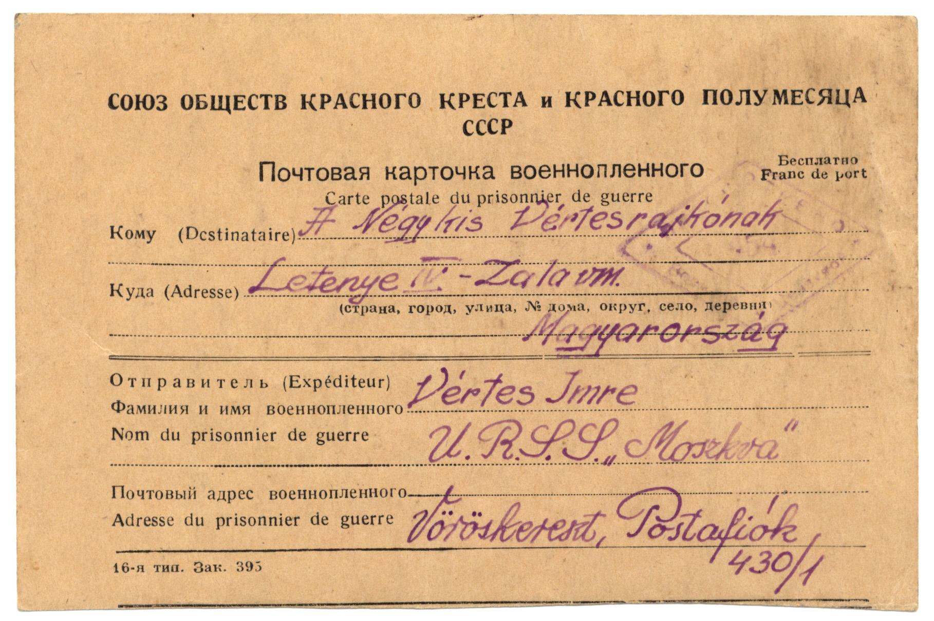 Nyilvános 1244 | 2233 | A Négy kis Vértesrajkónak | Letenye IV. - Zala vm. Magyarország Vértes Imre U.R.S.S. "Moszkva" Vöröskereszt, Postafiók 430/1. c. 1947. II. 10. Kicsiny fészek, benn négy fecske, Élő fészek élő kincse: Négy fióka; négy kis lélek Gellért, Jutka, bennem éltek, Eszter, Györgyi: Kicsi fecskék, Rátok szállnak álomlepkék Attól, akit hazavártok, Éj-nap, aki gondol Rátok. Messzeszakadt Apukátok |