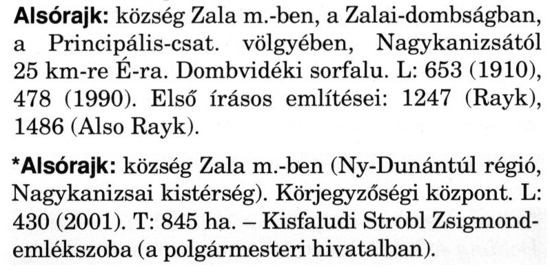 Nyilvános 2017 | 6347 | A szócikkek felismertetett szövege: | (A csillag után a kiegészítő kötetből származó szöveg következik) Alsórajk: község Zala m.-ben, a Zalai-dombságban, a Principális-csat. völgyében, Nagykanizsától 25 km-re É-ra. Dombvidéki sorfalu. L: 653 (1910), 478 (1990). Első írásos említései: 1247 (Rayk), 1486 (Also Rayk). * Alsórajk: község Zala m.-ben (Ny-Dunántúl régió, Nagykanizsai kistérség). Körjegyzőségi központ. L: 430 (2001). T: 845 ha. - Kisfaludi Strobl Zsigmondemlékszoba (a polgármesteri hivatalban). A szócikkek a következő lexikonból származnak: Cím: Magyar nagylexikon Közreműködő: Élesztős László (1949) (szerk.) ; Barabás Éva (1943) (szerk.) ; Berényi Gábor (1946) (szerk.) ; Bárány Lászlóné (szerk.) ; Adelmann-né Kertész Judit (1945) (közrem.) ; Froemel Károlyné Jáky Éva (1936) (közrem.) ; Akadémiai Kiadó és Nyomda Vállala Szerz. közl.: [... Élesztős László főszerk.] ; [szerk. Barabás Éva et al.] ; [bibliogr. Adelmanné Kertész Judit] ; [kész. az Akadémiai Kiadó Magyar Nagylexikon Szerkesztőségében] Kiadás: Budapest : Akad. K., 1993- Kötetei: 1. köt., A - Anc 2. köt., And - Bag 3. köt., Bah - Bij 4. köt., Bik - Bz 5. köt., C - Csem 6. köt., Csen - Ec 7. köt., Ed - Fe 8. köt., Ff - Gyep 9. köt., Gyer - Iq 10. köt., Ir - Kip 11. köt., Kir - Lem 12. köt., Len - Mep 13. köt., Mer - Nyk 14. köt., Nyl - Pom 15. köt., Pon - Sek 16. köt., Sel - Szö 17. köt., Szp - Ung 18. köt., Unh - Z 19. köt., Kiegészítő kötet, A - Z ETO jelzet: 030=945.11 Szakjelzet: 030 Cutter: M 14 ISBN: 963-05-6611-7 [!ISBN 963-05-6615-X] Nyelv: magyar Megjegyzés: Az 5. kötettől kiad. a Magyar Nagylexikon Kiadó ; A 6. kötettől főszerk. Berényi Gábor ; A 6. kötettől szakszerk. Bárány Lászlóné et al. ; A 6. kötettől bibliogr. Froemel Károlyné ; Bibliogr. a szócikkek végén |