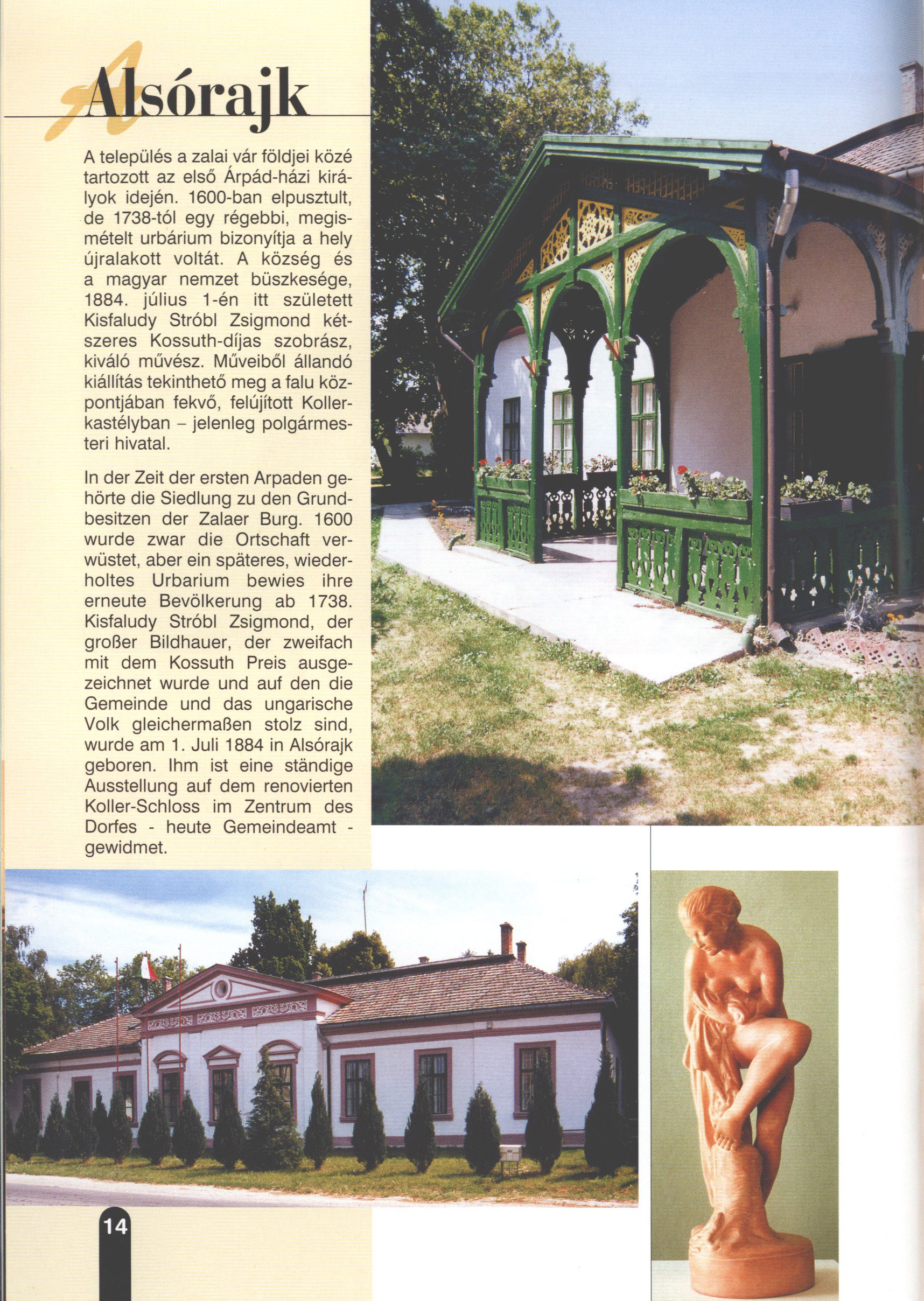 Nyilvános 1989 | 5931 | Alsórajk | In der Zeit der ersten Arpaden gehörte die Siedlung zu den Grundbesitzen der Zalaer Burg. 1600 wurde zwar die Ortschaft verwüstet, aber ein späteres, wiederholtes Urbarium bewies ihre erneute Bevölkerung ab 1738. Kisfaludy Stróbl Zsigmond, der großer Bildhauer, der zweifach mit dem Kossuth Preis ausgezeichnet wurde und auf den die Gemeinde und das ungarische Volk gleichermaßen stolz sind, wurde am 1. Juli 1884 in Alsórajk geboren. Ihm ist eine ständige Ausstellung auf dem renovierten Koller-Schloss im Zentrum des Dorfes - heute Gemeindeamt -gewidmet. Dieses Text stammt von: Titel: Hívogató a Régiók Kapujában - Útikönyv Látnivalók Nagykanizsán és Térségében (Einladend in dem Tor des Gebiets - Reisebuch - Sehenswürdigkeiten in Nagykanizsa und Umgebung) Herausgegeben von: Nagykanizsa és a Környező Települések Területfejlesztési Társulása (Verein für Gebietsentwicklung in Nagykanizsa und in ihrer Umgebung) 8800 Nagykanizsa, Petőfi Sándor út 5. Tel.: 06 93/536-453 • 06 93/536-454 Tel ./Fax: 06 93/326-323 E-mail: terstars@axelero.hu www.kanizsaterseg.celodin.hu |