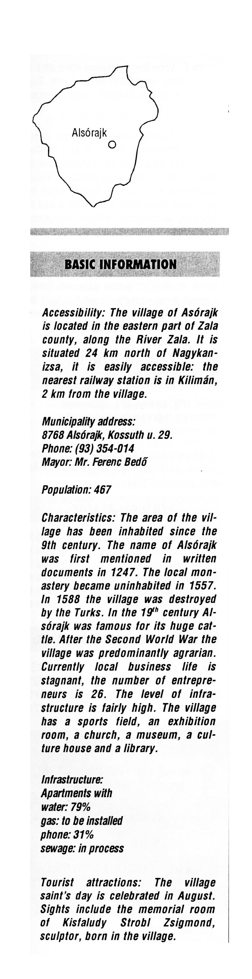 Nyilvános 1919 | 5874 | Alsórajk | BASIC INFORMATION Accessibility: The village of Alsórajk is located in the eastern part of Zala county, along the River Zala. It is situated 24 km north of Nagykanizsa, it is easily accessible: the nearest railway station is in Kilimán, 2 km from the village. Municipality address: 8768 Alsórajk, Kossuth u. 29. Phone: (93) 354-014 Mayor: Mr. Ferenc Bedő Population: 467 Characteristics: The area of the village has been inhabited since the 9th century. The name of Alsórajk was first mentioned in written documents in 1247. The local monastery became uninhabited in 1557. In 1588 the village was destroyed by the Turks. In the 19th century Alsórajk was famous for its huge cattle. After the Second World War the village was predominantly agrarian. Currently local business life is stagnant, the number of entrepreneurs is 26. The level of infrastructure is fairly high. The village has a sports field, an exhibition room, a church, a museum, a culture house and a library. Infrastructure: Apartments with water: 79% gas: to be installed phone: 31% sewage: in process Tourist attractions: The village saint's day is celebrated in August. Sights include the memorial room of Kisfaludy Strobl Zsigmond, sculptor, born in the village. This text came from the following book: Title: Handbook of Zala county (Zala megye kézikönyve) Series: County handbooks of Hungary (Magyarország megyei kézikönyvei) Chief editor: Hóbor József Publisher: (Hatvan), CEBA-Hungary Ltd, 1998 ETO: 908.439.121(035) ; 050.8(439.121) ISBN: 963-9089-18-2 Pages: 488-1040 p. Remark: Closed on: 1998. márc. 31. |
