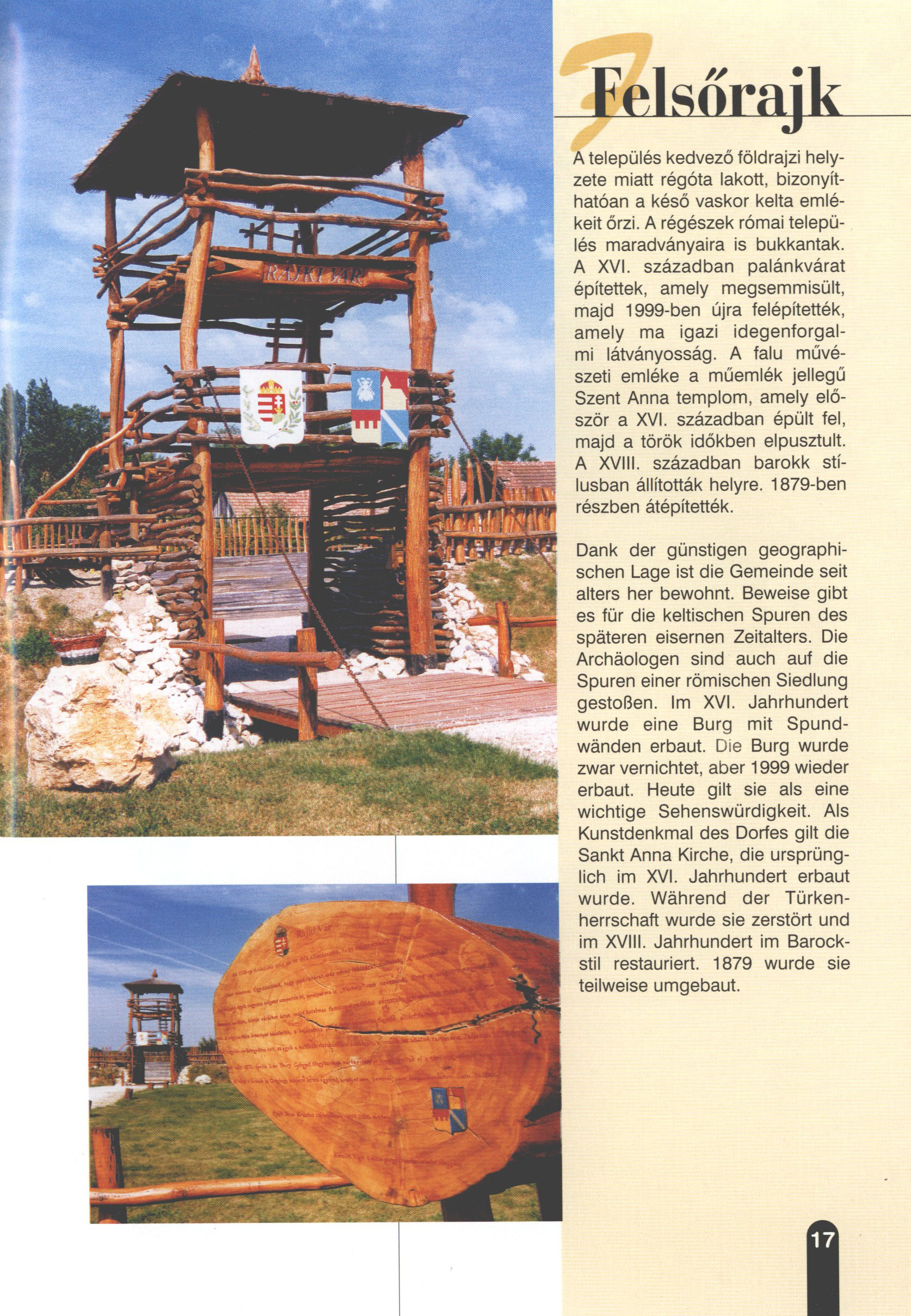 Nyilvános 2134 | 6112 | Felsőrajk | Dank der günstigen geographischen Lage ist die Gemeinde seit alters her bewohnt. Beweise gibt es für die keltischen Spuren des späteren eisernen Zeitalters. Die Archäologen sind auch auf die Spuren einer römischen Siedlung gestoßen. Im XVI. Jahrhundert wurde eine Burg mit Spundwänden erbaut. Die Burg wurde zwar vernichtet, aber 1999 wieder erbaut. Heute gilt sie als eine wichtige Sehenswürdigkeit. Als Kunstdenkmal des Dorfes gilt die Sankt Anna Kirche, die ursprünglich im XVI. Jahrhundert erbaut wurde. Während der Türkenherrschaft wurde sie zerstört und im XVIII. Jahrhundert im Barockstil restauriert. 1879 wurde sie teilweise umgebaut. Dieses Text stammt von: Titel: Hívogató a Régiók Kapujában - Útikönyv Látnivalók Nagykanizsán és Térségében (Einladend in dem Tor des Gebiets - Reisebuch - Sehenswürdigkeiten in Nagykanizsa und Umgebung) Herausgegeben von: Nagykanizsa és a Környező Települések Területfejlesztési Társulása (Verein für Gebietsentwicklung in Nagykanizsa und in ihrer Umgebung) 8800 Nagykanizsa, Petőfi Sándor út 5. Tel.: 06 93/536-453 • 06 93/536-454 Tel ./Fax: 06 93/326-323 E-mail: terstars@axelero.hu www.kanizsaterseg.celodin.hu |