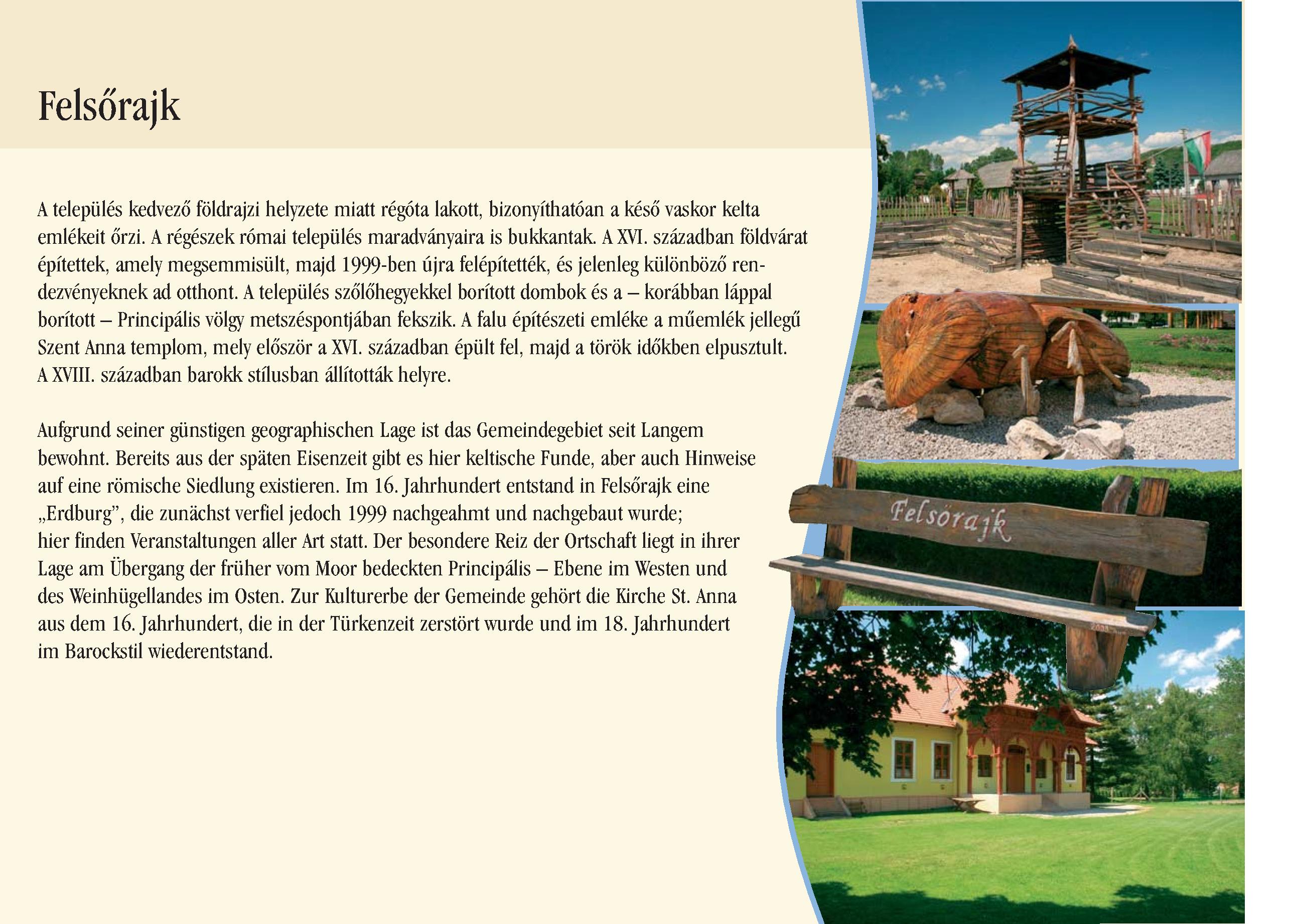 Nyilvános 2136 | 6409 | Felsőrajk | Aufgrund seiner günstigen geographischen Lage ist das Gemeindegebiet seit Langem bewohnt. Bereits aus der späten Eisenzeit gibt es hier keltische Funde, aber auch Hinweise auf eine römische Siedlung existieren. Im 16. Jahrhundert entstand in Felsőrajk eine ,,Erdburg", die zunächst verfiel jedoch 1999 nachgeahmt und nachgebaut wurde; hier finden Veranstaltungen aller Art statt. Der besondere Reiz der Ortschaft liegt in ihrer Lage am Übergang der früher vom Moor bedeckten Principális Ebene im Westen und des Weinhügellandes im Osten. Zur Kulturerbe der Gemeinde gehört die Kirche St. Anna aus dem 16. Jahrhundert, die in der Türkenzeit zerstört wurde und im 18. Jahrhundert im Barockstil wiederentstand. Dieses Text stammt von: Pannonhát tájpark prospektus 2006. Web: http://www.pannonhat.hu/ (auch in Deutsch) |