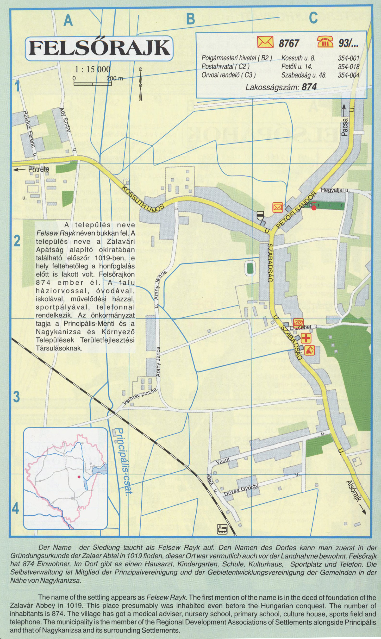 Nyilvános 2138 | 7410 | Felsőrajk | A település neveFelsew Rayknéven bukkan fel. A település neve a Zalavári Apátság alapító okiratában található először 1019-ben, e hely feltehetőleg a honfoglalás előtt is lakott volt. Felsőrajkon 874 ember él. A falu háziorvossal, óvodával, iskolával, művelődési házzal, sportpályával, telefonnal.rendelkezik. Az önkormányzat tagja a Principális-Menti és a Nagykanizsa és Környező Települések Területfejlesztési Társulásoknak. Der Name der Siedlung taucht als Felsew Rayk auf. Den Namen des Dorfes kann man zuerst in der Gründungsurkunde der Zalaer Abtei in 1019 finden, dieser Ort war vermutlich auch vor der Landnahme bewohnt. Felsőrajk hat 874 Einwohner. Im Dorf gibt es einen Hausarzt, Kindergarten, Schule, Kulturhaus, Sportplatz und Telefon. Die Selbstverwaltung ist Mitglied der Prinzipalvereinigung und der Gebietentwicklungsvereinigung der Gemeinden in der Nähe von Nagykanizsa. The name of the settling appears as Felsew Rayk. The first mention of the name is in the deed of foundation of the Zalavár Abbey in 1019. This place presumably was inhabited even before the Hungarian conquest. The number of inhabitants is 874. The village has got a medical adviser, nursery school, primary school, culture house, sports field and telephone. The municipality is the member of the Regional Development Associations of Settlements alongside Principális and that of Nagykanizsa and its surrounding Settlements. A részlet a következő kiadványból származik/Die Teile stammen vom volgenden Buch/This text came from the following book: Cím/Titel/Title: Zala megye településeinek atlasza - 257 település részletes térképe/Atlas der Komitat Zala - 257 Detailte Siedlungskarten/Zala county\'s Atlas - 257 settlement maps. Közreműködő/contributor: Lackner László (1943) (fotó) Kiadás/Ausgabe/Publisher: Gyula : HISZI-MAP, 1997 Sorozat/Serie/Series: Indulástól - megérkezésig... ETO: 912(439.121-2) ; 908.439.121 Cutter: Z 19 ISBN: 963-610-025-4 Oldalszám/Seiten/Pages: 323, 81 p. Megjegyzés/Note: Lezárva/Abgeschlossen am/Closed am: 1997. máj. 30. |