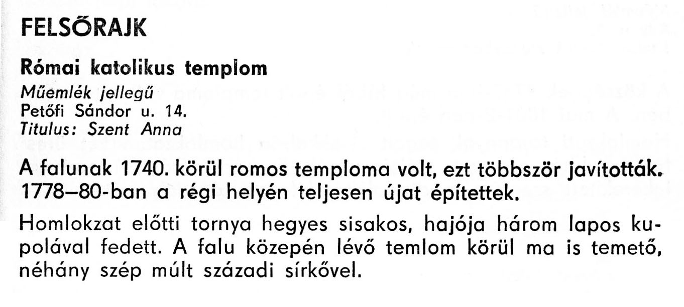 Nyilvános 1962 | 4022 | Felsőrajk - Zala megye műemlékei 1977 055-056old | A részlet szövege: FELSŐRAJK Római katolikus templom Műemlék jellegű Petőfi Sándor u. 14. Titulus: Szent Anna A falunak 1740. körül romos temploma volt, ezt többször javították. 1778–80-ban a régi helyén teljesen újat építettek. Homlokzat előtti tornya hegyes sisakos, hajója három lapos kupolával fedett. A falu közepén lévő temlom körül ma is temető, néhány szép múlt századi sírkővel. A részlet a következő könyvből származik: Cím: Zala megye műemlékei Szerző: Németh József (1928) Közreműködő: Lantos Miklós (fotó) Szerz. közl.: Németh József ; [fotók... Lantos Miklós] Kiadás: Zalaegerszeg : Zalai Ny., 1977 ETO jelzet: 72(439.121) ; 7.025.3/.4 ; 908.439.121 Tárgyszó: Zala megye Szakjelzet: 908 Cutter: N 53 Nyelv: magyar Oldalszám: 109 p. |