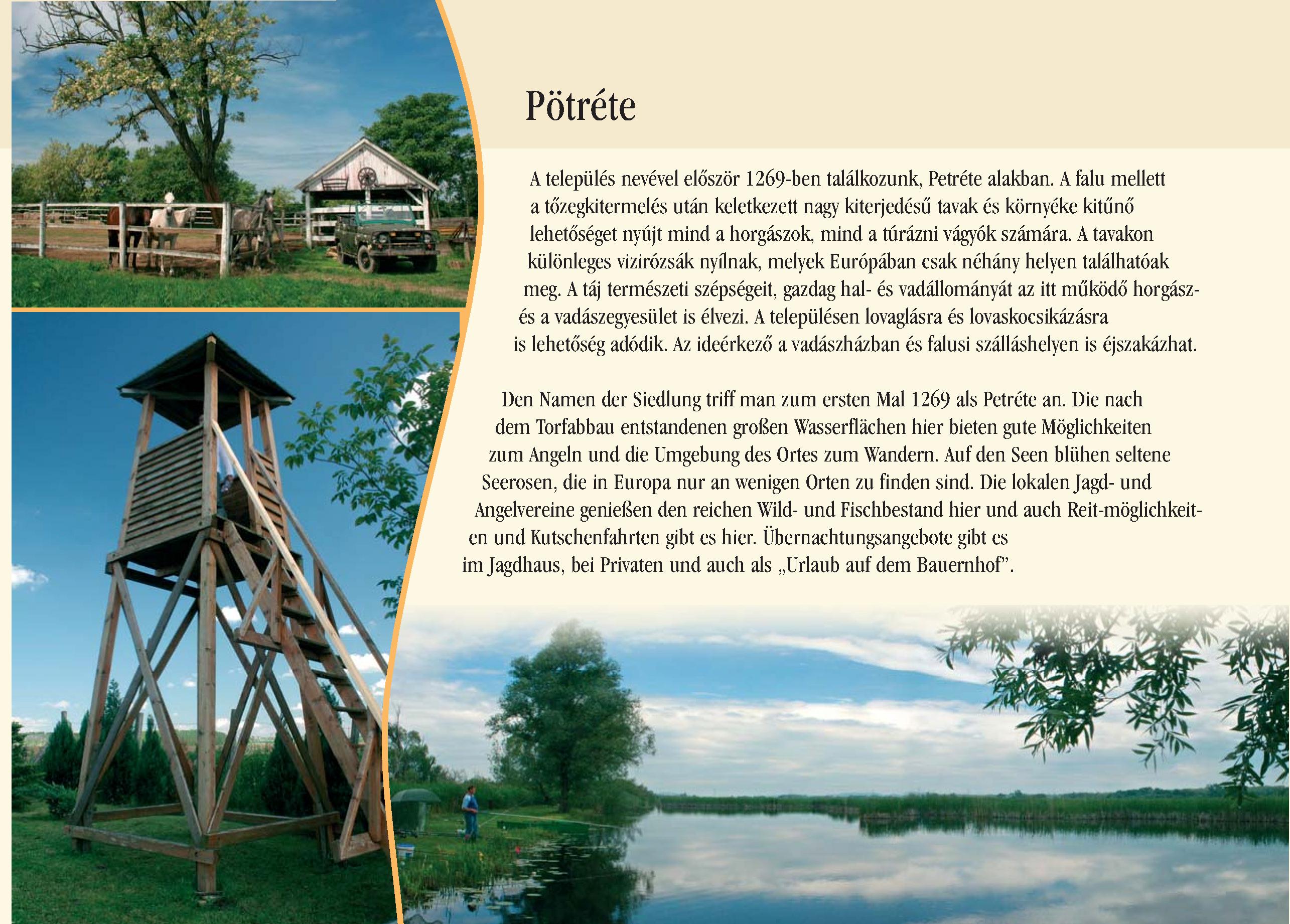 Nyilvános 2197 | 5926 | Pötréte | Den Namen der Siedlung triff man zum ersten Mal 1269 als Petréte an. Die nach dem Torfabbau entstandenen großen Wasserflächen hier bieten gute Möglichkeiten zum Angeln und die Umgebung des Ortes zum Wandern. Auf den Seen blühen seltene Seerosen, die in Europa nur an wenigen Orten zu finden sind. Die lokalen Jagd- und Angelvereine genießen den reichen Wild- und Fischbestand hier und auch Reit-möglichkeiten und Kutschenfahrten gibt es hier. Übernachtungsangebote gibt es im Jagdhaus, bei Privaten und auch als ,,Urlaub auf dem Bauernhof". Dieses Text stammt von: Pannonhát tájpark prospektus 2006. Web: http://www.pannonhat.hu/ (auch in Deutsch |