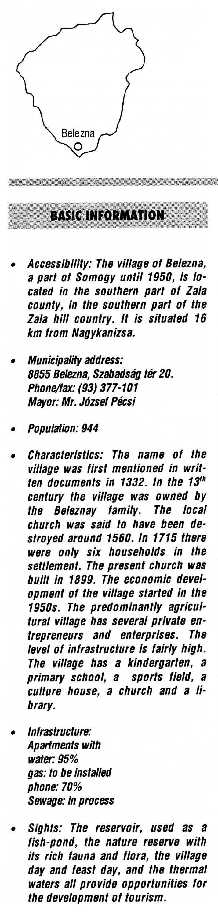 Nyilvános 2168 | 6498 | Belezna | BASIC INFORMATION • Accessibility: The village of Belezna, a part of Somogy until 1950, is located in the southern part of Zala county, in the southern part of the Zala hill country. It is situated 16 km from Nagykanizsa. • Municipality address: 8855 Belezna, Szabadság tér 20. Phone/fax: (93) 377-101 Mayor: Mr. József Pécsi • Population: 944 • Characteristics: The name of the village was first mentioned in written documents in 1332. In the 13th century the village was owned by the Beleznay family. The local church was said to have been destroyed around 1560. In 1715 there were only six households in the settlement. The present church was built in 1899. The economic development of the village started in the 1950s. The predominantly agricultural village has several private entrepreneurs and enterprises. The level of infrastructure is fairly high. The village has a kindergarten, a primary school, a sports field, a culture house, a church and a library. • Infrastructure: Apartments with water: 95% gas: to be installed phone: 70% Sewage: in process • Sights: The reservoir, used as a fish-pond, the nature reserve with its rich fauna and flora, the village day and feast day, and the thermal waters all provide opportunities for the development of tourism. This text came from the following book: Title: Handbook of Zala county (Zala megye kézikönyve) Series: County handbooks of Hungary (Magyarország megyei kézikönyvei) Chief editor: Hóbor József Publisher: (Hatvan), CEBA-Hungary Ltd, 1998 ETO: 908.439.121(035) ; 050.8(439.121) ISBN: 963-9089-18-2 Pages: 488-1040 p. Remark: Closed on: 1998. márc. 31. |