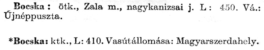Nyilvános 2176 | 5680 | A szócikkek felismertetett szövege: | (A csillag után az 1972-es kiadású kiegészítő kötetből származó szöveg következik) Bocska: ötk., Zala m., nagykanizsai j. L : 450. Vá.: Újnéppuszta. *Bocska: ktk., L: 410. Vasútállomása: Magyarszerdahely. A szócikkek a következő lexikonból származnak: Cím: Új magyar lexikon Közreműködő: Berei Andor (1900-1979) (szerk.) Szerz. közl.: [szerk. Berei Andor et al.] Kiadás jelzés: 2. lny. Kiadás: Budapest : Akad. K., 1961-1962 Kötetei: 1., A - C 2., D - F 3., G - J 4., K - Me 5., Mf - R 6., S - Z 7. köt., A-Z Kiegészítő kötet (1972) Kiegészítő kötet, 1962÷1980 (1981) ETO jelzet: 03=945.11 Szakjelzet: 030 Cutter: U 28 Nyelv: magyar Megjegyzés: Bibliogr. a címszavak egy részének végén |