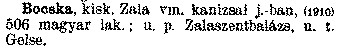 Nyilvános 2104 | 5670 | Cím: Révai nagy lexikona | Alcím: az ismeretek enciklopédiája Kiadás: Budapest : Révai testvérek, [1911]- Kötetei: 1. köt., A - Arany 2. köt., Arány - Beke 3. köt., Béke - Brutto 4. köt., Bratus - Csát 5. köt., Csata - Duc 6. köt., Duc - Etele 7. köt., Stelka - Földöv 8. köt., Földpálya - Gres 9. köt., Gréc - Herold 10. köt., Hérold - Jób 11. köt., Jób - Nontur 12. köt., Kontúr - Lovas 13. köt., Lovas - Mons 14. köt., Mens - Ottó 15. köt., Ottó - Racine 16. köt., Racine - Sodoma 17. köt., Sodoma - Tarján 18. köt., 19. köt., Vár - Zsüri | Kiegészítés Aachen - Beöthy 20. köt., Kiegészítés: Bér - Zsolt ETO jelzet: 03=945.11 Szakjelzet: 030 Cutter: R 62 Nyelv: magyar BOCSKA Bocska,kisk. Zala vm. kanizsai j.-ban, (1910) 506 magyar lak. ; u. p. Zalaszentbalázs, u. t. Gelse. |