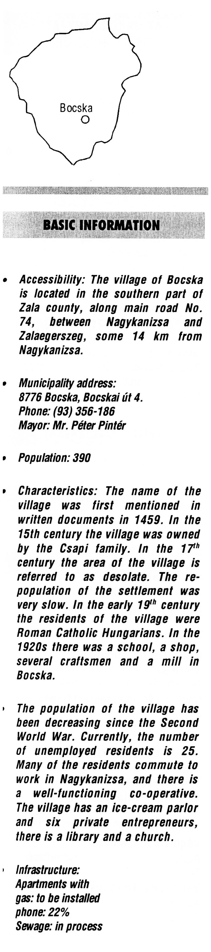 Nyilvános 2159 | 6021 | Bocska | BASIC INFORMATION Accessibility: The village of Bocska is located in the southern part of Zala county, along main road No. 74, between Nagykanizsa and Zalaegerszeg, some 14 km from Nagykanizsa. Municipality address: 8776 Bocska, Bocskai út 4. Phone: (93) 356-186 Mayor: Mr. Péter Pintér Population: 390 Characteristics: The name of the village was first mentioned in written documents in 1459. In the 15th century the village was owned by the Csapi family. In the 17th century the area of the village is referred to as desolate. The re-population of the settlement was very slow. In the early 19th century the residents of the village were Roman Catholic Hungarians. In the 1920s there was a school, a shop, several craftsmen and a mill in Bocska. The population of the village has been decreasing since the Second World War. Currently, the number of unemployed residents is 25. Many of the residents commute to work in Nagykanizsa, and there is a well-functioning co-operative. The village has an ice-cream parlor and six private entrepreneurs, there is a library and a church. Infrastructure: Apartments with gas: to be installed phone: 22% Sewage: in process This text came from the following book: Title: Handbook of Zala county (Zala megye kézikönyve) Series: County handbooks of Hungary (Magyarország megyei kézikönyvei) Chief editor: Hóbor József Publisher: (Hatvan), CEBA-Hungary Ltd, 1998 ETO: 908.439.121(035) ; 050.8(439.121) ISBN: 963-9089-18-2 Pages: 488-1040 p. Remark: Closed on: 1998. márc. 31. |