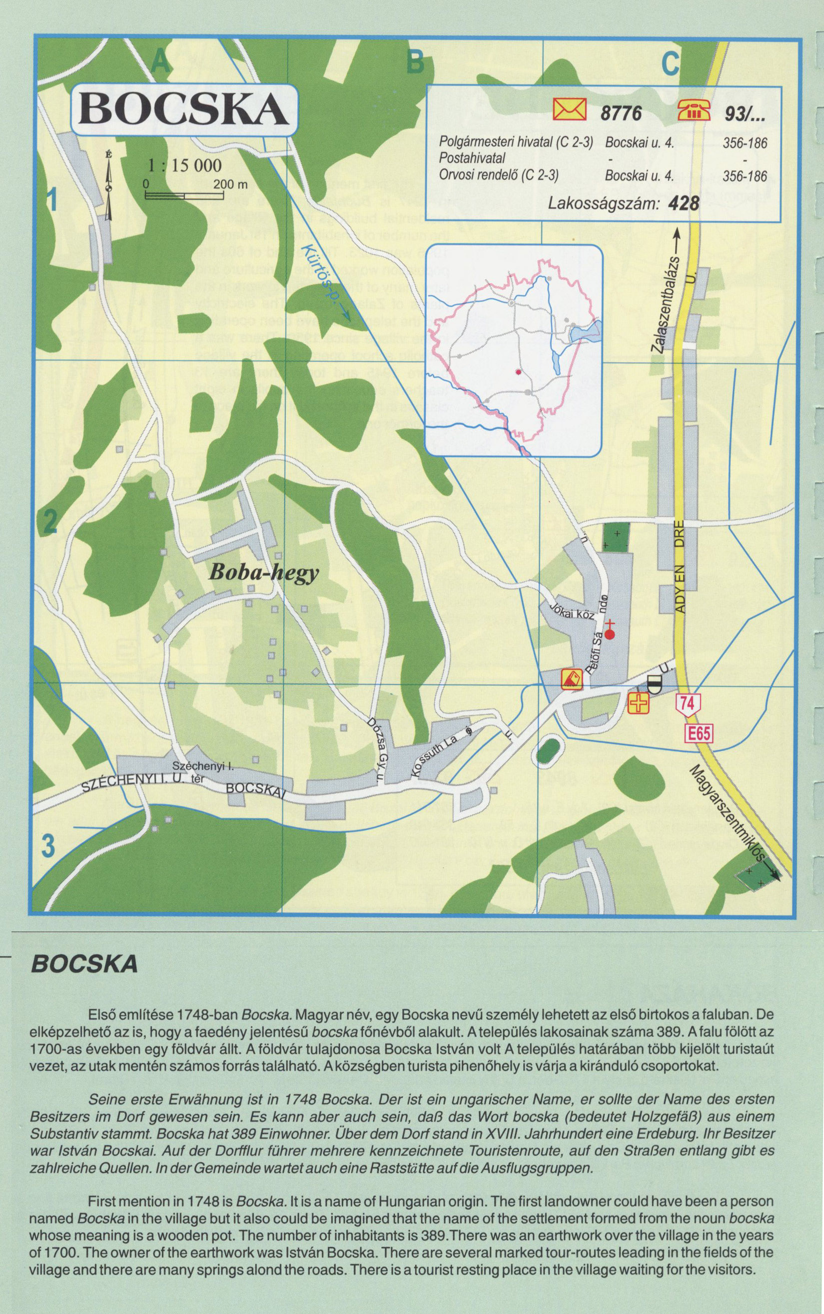 Nyilvános 2344 | 9268 | BOCSKA | Első említése 1748-ban Bocska. Magyar név, egy Bocska nevű személy lehetett az első birtokos a faluban. De elképzelhető az is, hogy a faedény jelentésű bocska főnévből alakult. A település lakosainak száma 389.A falu fölött az 1700-as években egy földvár állt. A földvár tulajdonosa Bocska István volt A település határában több kijelölt turistaút vezet, az utak mentén számos forrás található. A községben turista pihenőhely is várja a kiránduló csoportokat. Seine erste Erwähnung ist in 1748 Bocska. Der ist ein ungarischer Name, er sollte der Name des ersten Besitzers im Dorf gewesen sein. Es kann aber auch sein, daß das Wort bocska (bedeutet Holzgefäß) aus einem Substantiv stammt. Bocska hat 389 Einwohner. Über dem Dorfstand in XVIII. Jahrhundert eine Erdeburg. Ihr Besitzer war István Bocskai. Auf der Dorfflur führer mehrere kennzeichnete Touristenroute, auf den Straßen entlang gibt es zahlreiche Quellen. In der Gemeinde wartet auch eine Raststätte auf die Ausflugsgruppen. First mention in 1748 is Bocska. It is a name of Hungarian origin. The first landowner could have been a person named Bocska in the village but it also could be imagined that the name of the settlement formed from the noun bocska whose meaning is a wooden pot. The number of inhabitants is 389.There was an earthwork over the village in the years of 1700. The owner of the earthwork was István Bocska. There are several marked tour-routes leading in the fields of the village and there are many springs alond the roads. There is a tourist resting place in the village waiting forthe visitors. A részlet a következő kiadványból származik/Die Teile stammen vom volgenden Buch/This text came from the following book: Cím/Titel/Title: Zala megye településeinek atlasza - 257 település részletes térképe/Atlas der Komitat Zala - 257 Detailte Siedlungskarten/Zala county\'s Atlas - 257 settlement maps. Közreműködő/contributor: Lackner László (1943) (fotó) Kiadás/Ausgabe/Publisher: Gyula : HISZI-MAP, 1997 Sorozat/Serie/Series: Indulástól - megérkezésig... ETO: 912(439.121-2) ; 908.439.121 Cutter: Z 19 ISBN: 963-610-025-4 Oldalszám/Seiten/Pages: 323, 81 p. Megjegyzés/Note: Lezárva/Abgeschlossen am/Closed am: 1997. máj. 30. |