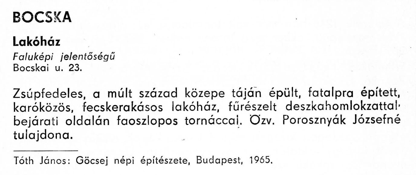 Nyilvános 2098 | 5700 | Bocska - Zala megye műemlékei 1977 046old | A részlet szövege: BOCSKA Lakóház Faluképi jelentőségű Bocskai u. 23. Zsúpfedeles, a múlt század közepe táján épült, fatalpra épített, karóközös, fecskerakásos lakóház, fűrészelt deszkahomlokzattal, bejárati oldalán faoszlopos tornáccal, özv. Porosznyák Józsefné tulajdona. Tóth János: Göcsej népi építészete, Budapest, 1965. A részlet a következő könyvből származik: Cím: Zala megye műemlékei Szerző: Németh József (1928) Közreműködő: Lantos Miklós (fotó) Szerz. közl.: Németh József ; [fotók... Lantos Miklós] Kiadás: Zalaegerszeg : Zalai Ny., 1977 ETO jelzet: 72(439.121) ; 7.025.3/.4 ; 908.439.121 Tárgyszó: Zala megye Szakjelzet: 908 Cutter: N 53 Nyelv: magyar Oldalszám: 109 p. |