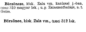 Nyilvános 2168 | 5911 | Börzöncze,kisk. Zala vm. kanizsai j.-ban, (1910) 310 magyar lak. ; u. p. Zalaszentbalázs, u. t. Gelse. Börzönce kisk. Zala Vm., (1920) 312 lak. Cím: Révai nagy lexikona Alcím: az ismeretek enciklopédiája Kiadás: Budapest : Révai testvérek, [1911]- Kötetei: 1. köt., A - Arany 2. köt., Arány - Beke 3. köt., Béke - Brutto 4. köt., Bratus - Csát 5. köt., Csata - Duc 6. köt., Duc - Etele 7. köt., Stelka - Földöv 8. köt., Földpálya - Gres 9. köt., Gréc - Herold 10. köt., Hérold - Jób 11. köt., Jób - Nontur 12. köt., Kontúr - Lovas 13. köt., Lovas - Mons 14. köt., Mens - Ottó 15. köt., Ottó - Racine 16. köt., Racine - Sodoma 17. köt., Sodoma - Tarján 18. köt., 19. köt., Vár - Zsüri | Kiegészítés Aachen - Beöthy 20. köt., Kiegészítés: Bér - Zsolt ETO jelzet: 03=945.11 Szakjelzet: 030 Cutter: R 62 Nyelv: magyar |