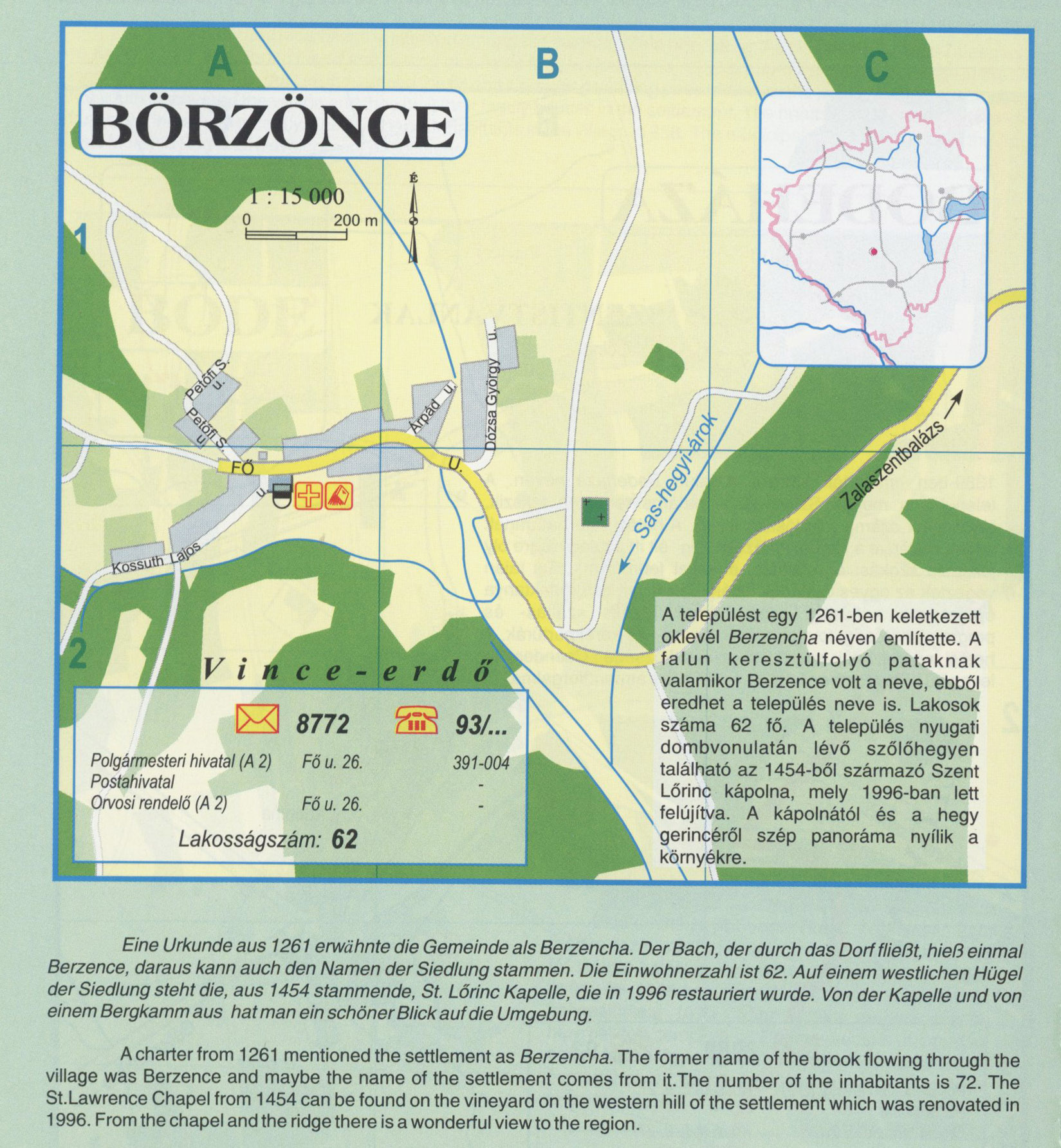 Nyilvános 2349 | 9038 | Börzönce | A települést egy 1261-ben keletkezett oklevél Berzencha néven említette. A falun keresztülfolyó pataknak valamikor Berzence volt a neve, ebből eredhet a település neve is. Lakosok száma 62 fő. A település nyugati dombvonulatán lévő szőlőhegyentalálható az 1454-ből származó SzentLőrinc kapolna, mely 1996-ban lett felújítva. A kápolnatól és a hegy gerincéről szép panoráma nyílik a környékre. Eine Urkunde aus 1261 erwdhnte die Gemeinde als Berzencha. Der Bach, der dutch das Dorf flieSt, hieR einmal Berzence, daraus kann auch den Namen der Siedlung stammen. Die Einwohnerzahl ist 62. Auf einem westlichen Hugel der Siedlung steht die, aus 1454 stammende, St. Lorinc Kapelle, die in 1996 restauriert wurde. Von der Kapelle und von einem Bergkamm aus hat man ein schonerBlickaufdie Umgebung. A charter from 1261 mentioned the settlement as Berzencha. The former name of the brook flowing through the village was Berzence and maybe the name of the settlement comes from it.The number of the inhabitants is 72. The St.Lawrence Chapel from 1454 can be found on the vineyard on the western hill of the settlement which was renovated in 1996. From the chapel and the ridge there is a wonderful view to the region. A részlet a következő kiadványból származik/Die Teile stammen vom volgenden Buch/This text came from the following book: Cím/Titel/Title: Zala megye településeinek atlasza - 257 település részletes térképe/Atlas der Komitat Zala - 257 Detailte Siedlungskarten/Zala county\'s Atlas - 257 settlement maps. Közreműködő/contributor: Lackner László (1943) (fotó) Kiadás/Ausgabe/Publisher: Gyula : HISZI-MAP, 1997 Sorozat/Serie/Series: Indulástól - megérkezésig... ETO: 912(439.121-2) ; 908.439.121 Cutter: Z 19 ISBN: 963-610-025-4 Oldalszám/Seiten/Pages: 323, 81 p. Megjegyzés/Note: Lezárva/Abgeschlossen am/Closed am: 1997. máj. 30. |