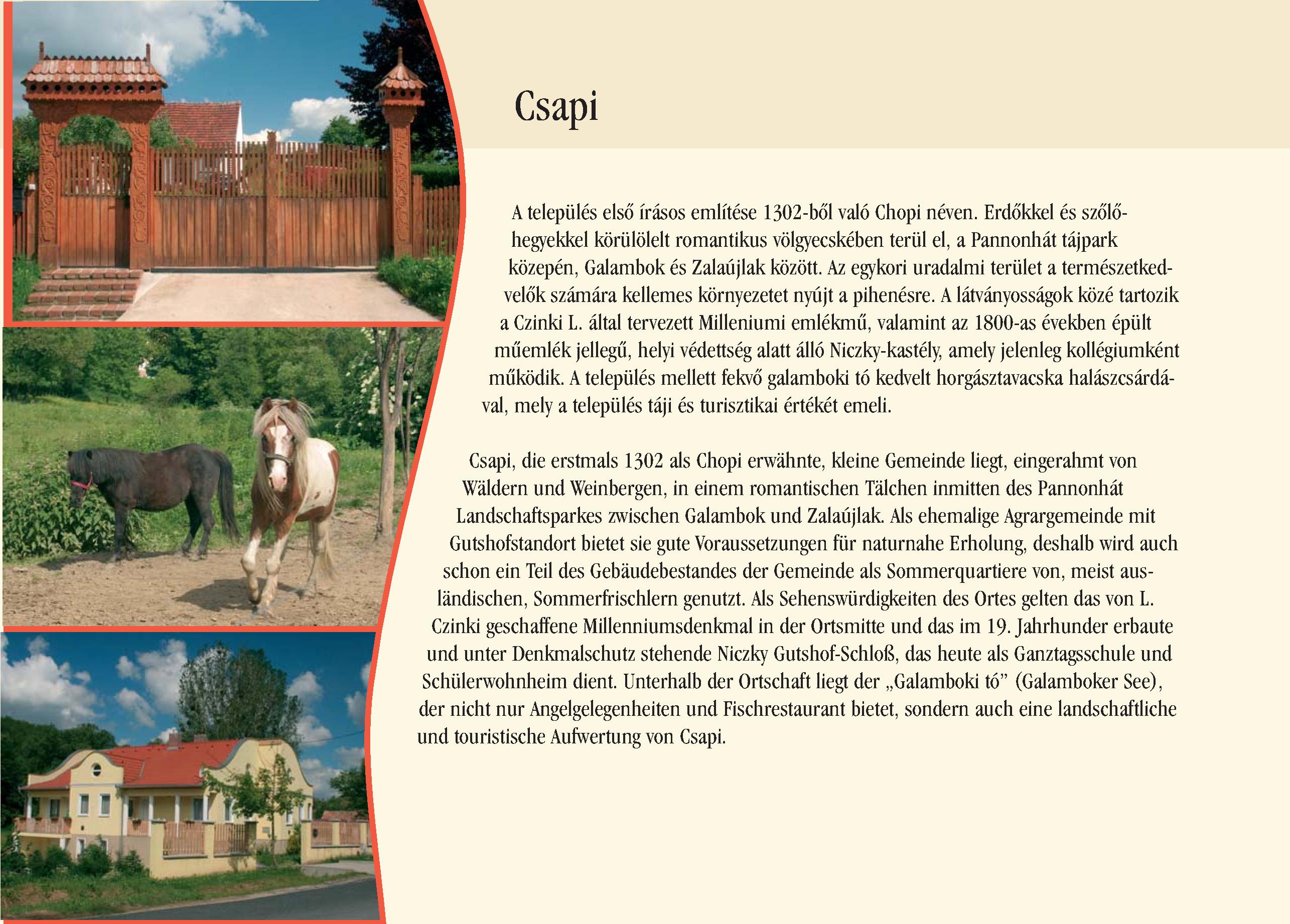 Nyilvános 2341 | 8403 | Csapi | Csapi, die erstmals 1302 als Chopi erwähnte, kleine Gemeinde liegt, eingerahmt von Wäldern und Weinbergen, in einem romantischen Tälchen inmitten des Pannonhát Landschaftsparkes zwischen Galambok und Zalaújlak. Als ehemalige Agrargemeinde mit Gutshofstandort bietet sie gute Voraussetzungen für naturnahe Erholung, deshalb wird auch schon ein Teil des Gebäudebestandes der Gemeinde als Sommerquartiere von, meist ausländischen, Sommerfrischlern genutzt. Als Sehenswürdigkeiten des Ortes gelten das von L. Czinki geschaffene Millenniumsdenkmal in der Ortsmitte und das im 19. Jahrhunder erbaute und unter Denkmalschutz stehende Niczky Gutshof-Schloß, das heute als Ganztagsschule und Schülerwohnheim dient. Unterhalb der Ortschaft liegt der ,,Galamboki tó" (Galamboker See), der nicht nur Angelgelegenheiten und Fischrestaurant bietet, sondern auch eine landschaftliche und touristische Aufwertung von Csapi. Dieses Text stammt von: Pannonhát tájpark prospektus 2006. Web: http://www.pannonhat.hu/ (auch in Deutsch) |