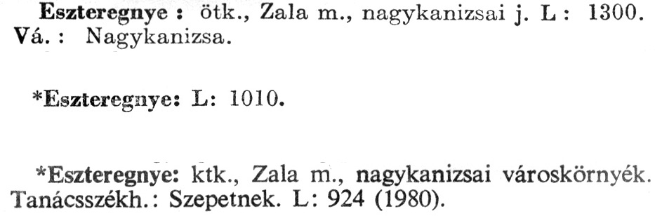 Nyilvános 2195 | 6095 | A szócikkek felismertetett szövege: | (Az első csillag után az 1972-es, a második csillag után az 1981-es kiadású kiegészítő kötetből származó szöveg következik) Eszteregnye : ötk., Zala m., nagykanizsai j. L : 1300. Vá. : Nagykanizsa. *Eszteregnye: L: 1010. *Eszteregnye: ktk., Zala m., nagykanizsai városkörnyék. Tanácsszékh.: Szepetnek. L: 924 (1980). A szócikkek a következő lexikonból származnak: Cím: Új magyar lexikon Közreműködő: Berei Andor (1900-1979) (szerk.) Szerz. közl.: [szerk. Berei Andor et al.] Kiadás jelzés: 2. lny. Kiadás: Budapest : Akad. K., 1961-1962 Kötetei: 1., A - C 2., D - F 3., G - J 4., K - Me 5., Mf - R 6., S - Z 7. köt., A-Z Kiegészítő kötet (1972) Kiegészítő kötet, 1962÷1980 (1981) ETO jelzet: 03=945.11 Szakjelzet: 030 Cutter: U 28 Nyelv: magyar Megjegyzés: Bibliogr. a címszavak egy részének végén |