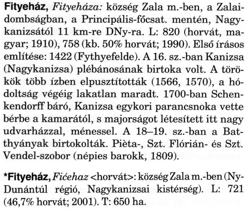 Nyilvános 2063 | 5463 | A szócikkek felismertetett szövege: | (A csillag után a kiegészítő kötetből származó szöveg következik) Fityeház, Fityeháza: község Zala m.-ben, a Zalaidombságban, a Principális-főcsat. mentén, Nagykanizsától 11 km-re DNy-ra. L: 820 (horvát, magyar; 1910), 758 (kb. 50% horvát; 1990). Első írásos említése: 1422 (Fythyefelde). A 16. sz.-ban Kanizsa (Nagykanizsa) plébánosának birtoka volt. A törökök több ízben elpusztították (1566, 1570), a hódoltság végéig lakatlan maradt. 1700-ban Schen-kendorff báró, Kanizsa egykori parancsnoka vette bérbe a kamarától, s majorságot létesített itt nagy udvarházzal, ménessel. A 18—19. sz.-ban a Bat-thyányak birtokolták. Piéta-, Szt. Flórián- és Szt. Vendel-szobor (népies barokk, 1809). *Fityeház, Ficehaz <horvát>: község Zala m.-ben (Ny-Dunántúl régió, Nagykanizsai kistérség). L: 721 (46,7% horvát; 2001). T: 650 ha. A szócikkek a következő lexikonból származnak: Cím: Magyar nagylexikon Közreműködő: Élesztős László (1949) (szerk.) ; Barabás Éva (1943) (szerk.) ; Berényi Gábor (1946) (szerk.) ; Bárány Lászlóné (szerk.) ; Adelmann-né Kertész Judit (1945) (közrem.) ; Froemel Károlyné Jáky Éva (1936) (közrem.) ; Akadémiai Kiadó és Nyomda Vállala Szerz. közl.: [... Élesztős László főszerk.] ; [szerk. Barabás Éva et al.] ; [bibliogr. Adelmanné Kertész Judit] ; [kész. az Akadémiai Kiadó Magyar Nagylexikon Szerkesztőségében] Kiadás: Budapest : Akad. K., 1993- Kötetei: 1. köt., A - Anc 2. köt., And - Bag 3. köt., Bah - Bij 4. köt., Bik - Bz 5. köt., C - Csem 6. köt., Csen - Ec 7. köt., Ed - Fe 8. köt., Ff - Gyep 9. köt., Gyer - Iq 10. köt., Ir - Kip 11. köt., Kir - Lem 12. köt., Len - Mep 13. köt., Mer - Nyk 14. köt., Nyl - Pom 15. köt., Pon - Sek 16. köt., Sel - Szö 17. köt., Szp - Ung 18. köt., Unh - Z 19. köt., Kiegészítő kötet, A - Z ETO jelzet: 030=945.11 Szakjelzet: 030 Cutter: M 14 ISBN: 963-05-6611-7 [!ISBN 963-05-6615-X] Nyelv: magyar Megjegyzés: Az 5. kötettől kiad. a Magyar Nagylexikon Kiadó ; A 6. kötettől főszerk. Berényi Gábor ; A 6. kötettől szakszerk. Bárány Lászlóné et al. ; A 6. kötettől bibliogr. Froemel Károlyné ; Bibliogr. a szócikkek végén |