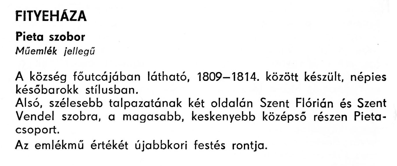 Nyilvános 2059 | 6158 | Fityeháza - Zala megye műemlékei 1977 056old | A részlet szövege: FITYEHÁZA Pieta szobor Műemlék jellegű A község főutcájában látható, 1809-1814. között készült, népies későbarokk stílusban. Alsó, szélesebb talpazatának két oldalán Szent Flórián és Szent Vendel szobra, a magasabb, keskenyebb középső részen Pieta-csoport. Az emlékmű értékét újabbkori festés rontja. A részlet a következő könyvből származik: Cím: Zala megye műemlékei Szerző: Németh József (1928) Közreműködő: Lantos Miklós (fotó) Szerz. közl.: Németh József ; [fotók... Lantos Miklós] Kiadás: Zalaegerszeg : Zalai Ny., 1977 ETO jelzet: 72(439.121) ; 7.025.3/.4 ; 908.439.121 Tárgyszó: Zala megye Szakjelzet: 908 Cutter: N 53 Nyelv: magyar Oldalszám: 109 p. |