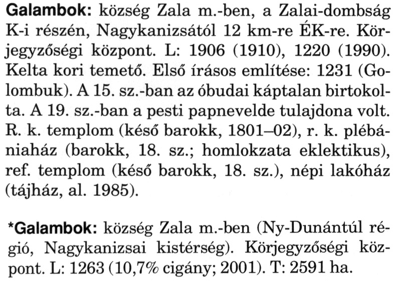 Nyilvános 2018 | 4319 | A szócikkek felismertetett szövege: | (A csillag után a kiegészítő kötetből származó szöveg következik) Galambok: község Zala m.-ben, a Zalai-dombság K-i részén, Nagykanizsától 12 km-re ÉK-re. Körjegyzőségi központ. L: 1906 (1910), 1220 (1990). Kelta kori temető. Első írásos említése: 1231 (Go-lombuk). A 15. sz.-ban az óbudai káptalan birtokolta. A 19. sz.-ban a pesti papnevelde tulajdona volt. R. k. templom (késő barokk, 1801-02), r. k. plébániaház (barokk, 18. sz.; homlokzata eklektikus), ref. templom (késő barokk, 18. sz.), népi lakóház (tájház, al. 1985). *Galambok: község Zala m.-ben (Ny-Dunántúl régió, Nagykanizsai kistérség). Körjegyzőségi központ. L: 1263 (10,7% cigány; 2001). T: 2591 ha. A szócikkek a következő lexikonból származnak: Cím: Magyar nagylexikon Közreműködő: Élesztős László (1949) (szerk.) ; Barabás Éva (1943) (szerk.) ; Berényi Gábor (1946) (szerk.) ; Bárány Lászlóné (szerk.) ; Adelmann-né Kertész Judit (1945) (közrem.) ; Froemel Károlyné Jáky Éva (1936) (közrem.) ; Akadémiai Kiadó és Nyomda Vállala Szerz. közl.: [... Élesztős László főszerk.] ; [szerk. Barabás Éva et al.] ; [bibliogr. Adelmanné Kertész Judit] ; [kész. az Akadémiai Kiadó Magyar Nagylexikon Szerkesztőségében] Kiadás: Budapest : Akad. K., 1993- Kötetei: 1. köt., A - Anc 2. köt., And - Bag 3. köt., Bah - Bij 4. köt., Bik - Bz 5. köt., C - Csem 6. köt., Csen - Ec 7. köt., Ed - Fe 8. köt., Ff - Gyep 9. köt., Gyer - Iq 10. köt., Ir - Kip 11. köt., Kir - Lem 12. köt., Len - Mep 13. köt., Mer - Nyk 14. köt., Nyl - Pom 15. köt., Pon - Sek 16. köt., Sel - Szö 17. köt., Szp - Ung 18. köt., Unh - Z 19. köt., Kiegészítő kötet, A - Z ETO jelzet: 030=945.11 Szakjelzet: 030 Cutter: M 14 ISBN: 963-05-6611-7 [!ISBN 963-05-6615-X] Nyelv: magyar Megjegyzés: Az 5. kötettől kiad. a Magyar Nagylexikon Kiadó ; A 6. kötettől főszerk. Berényi Gábor ; A 6. kötettől szakszerk. Bárány Lászlóné et al. ; A 6. kötettől bibliogr. Froemel Károlyné ; Bibliogr. a szócikkek végén |