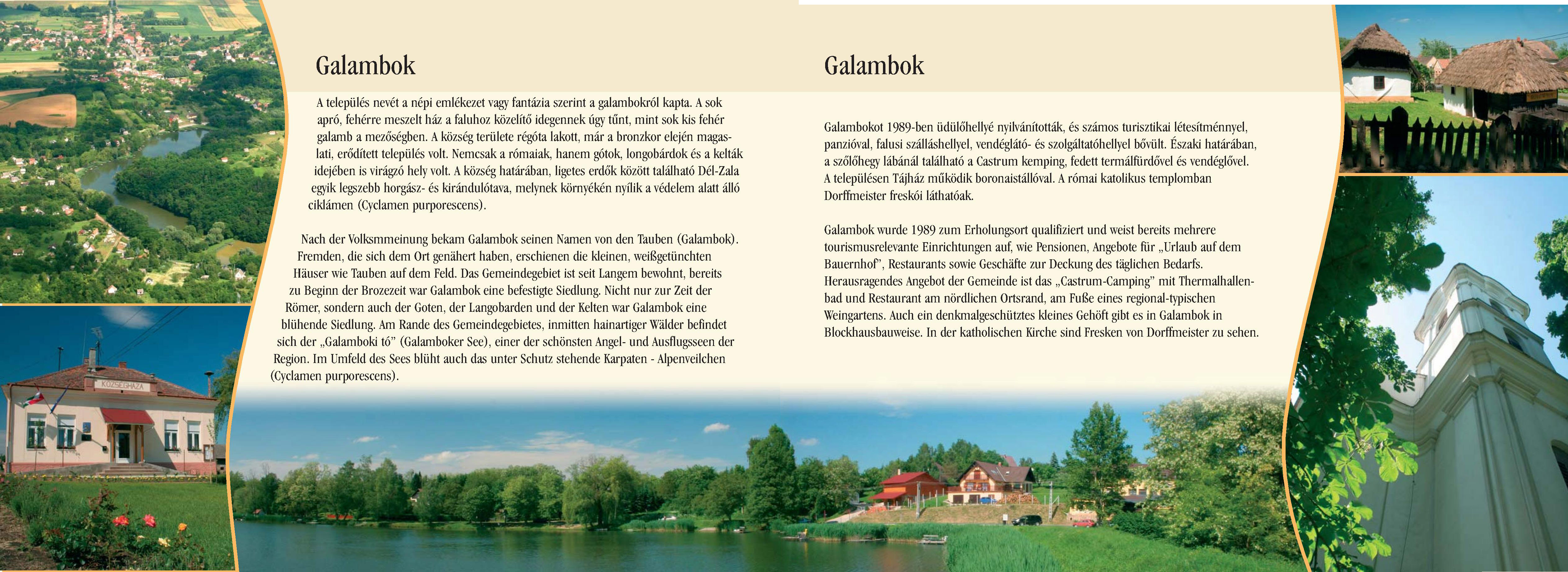 Nyilvános 2291 | 6699 | Galambok | Nach der Volksmmeinung bekam Galambok seinen Namen von den Tauben (Galambok). Fremden, die sich dem Ort genähert haben, erschienen die kleinen, weißgetünchten Häuser wie Tauben auf dem Feld. Das Gemeindegebiet ist seit Langem bewohnt, bereits zu Beginn der Brozezeit war Galambok eine befestigte Siedlung. Nicht nur zur Zeit der Römer, sondern auch der Goten, der Langobarden und der Kelten war Galambok eine blühende Siedlung. Am Rande des Gemeindegebietes, inmitten hainartiger Wälder befindet sich der ,,Galamboki tó" (Galamboker See), einer der schönsten Angel- und Ausflugsseen der Region. Im Umfeld des Sees blüht auch das unter Schutz stehende Karpaten – Alpenveilchen (Cyclamen purporescens). Galambok wurde 1989 zum Erholungsort qualifiziert und weist bereits mehrere tourismusrelevante Einrichtungen auf, wie Pensionen, Angebote für ,,Urlaub auf dem Bauernhof", Restaurants sowie Geschäfte zur Deckung des täglichen Bedarfs. Herausragendes Angebot der Gemeinde ist das ,,Castrum-Camping" mit Thermalhallenbad und Restaurant am nördlichen Ortsrand, am Fuße eines regional-typischen Weingartens. Auch ein denkmalgeschütztes kleines Gehöft gibt es in Galambok in Blockhausbauweise. In der katholischen Kirche sind Fresken von Dorffmeister zu sehen. Dieses Text stammt von: Pannonhát tájpark prospektus 2006. Web: http://www.pannonhat.hu/ (auch in Deutsch) |