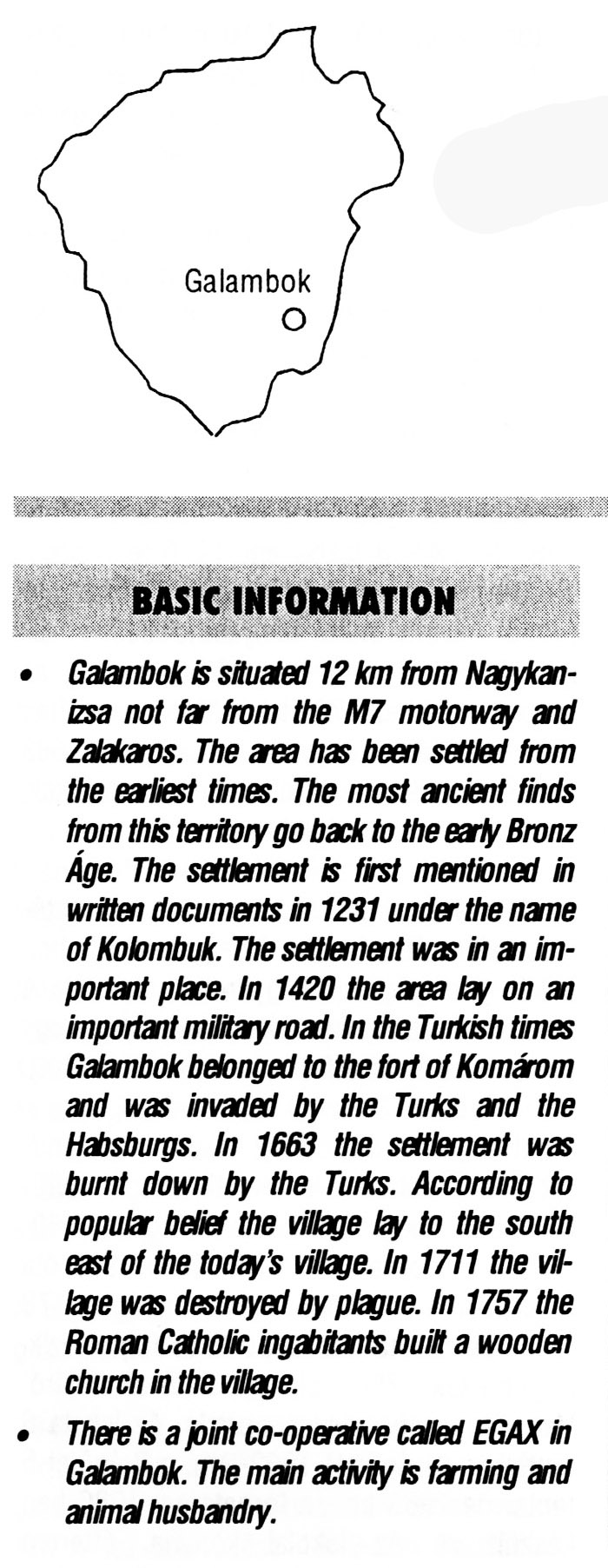 Nyilvános 2232 | 6554 | Rövid leírás | Teljes leírás (1.35 KB) | Galambok BASIC INFORMATION Galambok is situated 12 km from Nagykanizsa not far from the M7 motorway and Zalakaros. The area has been settled from the earliest times. The most ancient finds from this territory go back to the early Bronz Age. The settlement is first mentioned in written documents in 1231 under the name of Kolombuk. The settlement was in an important place. In 1420 the area lay on an important military road. In the Turkish times Galambok belonged to the fort of Komárom and was invaded by the Turks and the Habsburgs. In 1663 the settlement was burnt down by the Turks. According to popular belief the village lay to the south east of the today\'s village. In 1711 the village was destroyed by plague. In 1757 the Roman Catholic ingabitants built a wooden church in the village. There is a joint co-operative called EGAX in Galambok. The main activity is farming and animal husbandry. This text came from the following book: Title: Handbook of Zala county (Zala megye kézikönyve) Series: County handbooks of Hungary (Magyarország megyei kézikönyvei) Chief editor: Hóbor József Publisher: (Hatvan), CEBA-Hungary Ltd, 1998 ETO: 908.439.121(035) ; 050.8(439.121) ISBN: 963-9089-18-2 Pages: 488-1040 p. Remark: Closed on: 1998. márc. 31. |