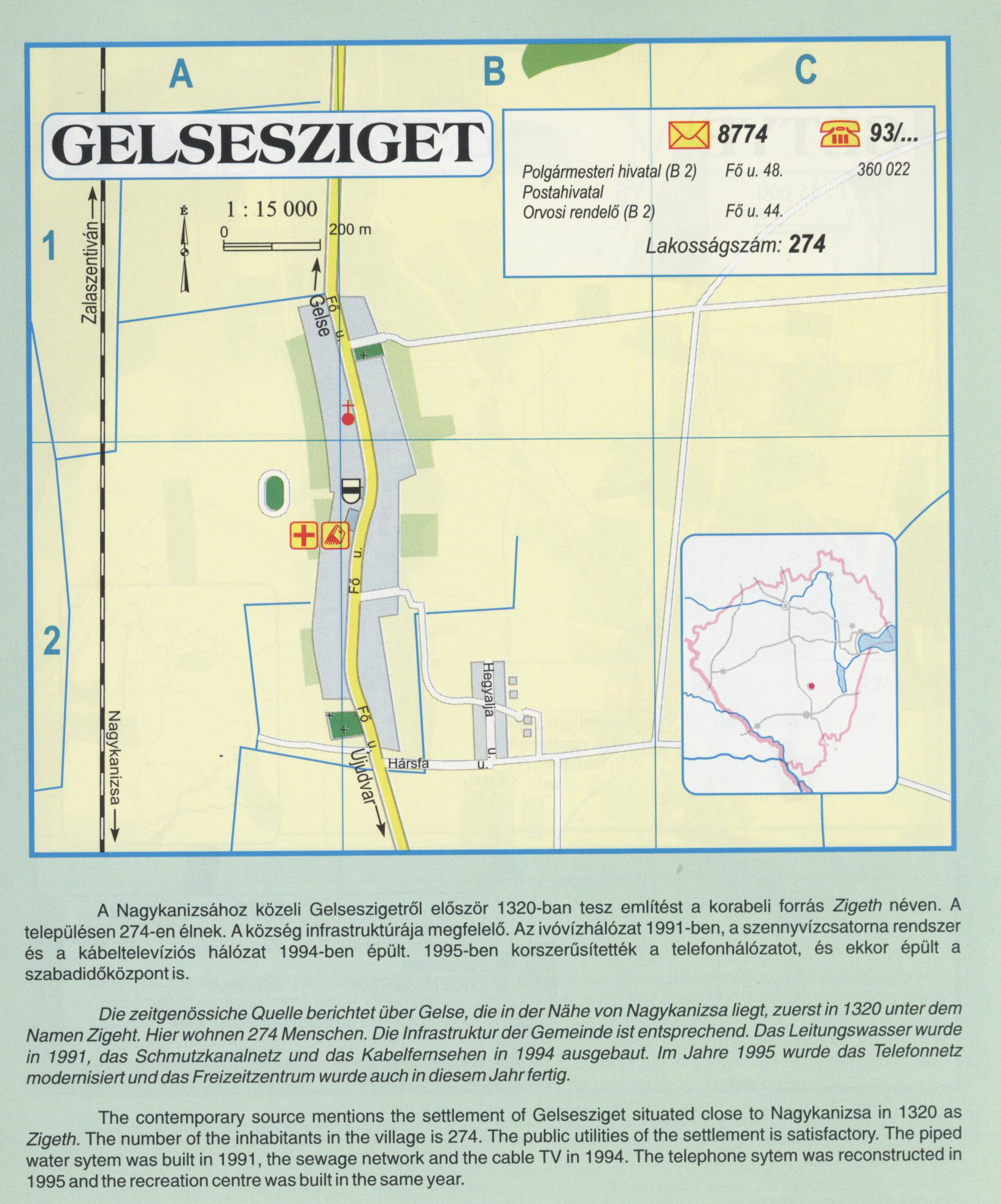 Nyilvános 2065 | 7239 | GELSESZIGET | A Nagykanizsához közeli Gelseszigetről először 1320-ban tesz említést a korabeli forrás Zigeth néven. A településen 274-en élnek. A község infrastruktúrája megfelelő. Az ivóvízhálózat 1991 -ben, a szennyvízcsatorna rendszer és a kábeltelevíziós hálózat 1994-ben épült. 1995-ben korszerűsítették a telefonhálózatot, és ekkor épült a szabadidőközpont is. Die zeitgenössiche Quelle berichtet über Gelse, die in der Nahe von Nagykanizsa liegt, zuerst in 1320 unter dem Namen Zigeht. Hier wohnen 274 Menschen. Die Infrastruktur der Gemeinde isi entsprechend. Das Leitungswasser wurde in 1991, das Schmutzkanalnetz und das Kabelfernsehen in 1994 ausgebaut. lm Jahre 1995 wurde das Telefonnetz modernisiert und das Freizeitzentrum wurde auch in diesem Jahr fertig. The contemporary source mentions the settlement of Gelsesziget situated close to Nagykanizsa in 1320 as Zigeth. The number of the inhabitants in the village is 274. The public Utilities of the settlement is satisfactory. The piped water sytem was built in 1991, the sewage network and the cable TV in 1994. The telephoné sytem was reconstructed in 1995 and the recreation centre was built in the same year. A részlet a következő kiadványból származik/Die Teile stammen vom volgenden Buch/This text came from the following book: Cím/Titel/Title: Zala megye településeinek atlasza - 257 település részletes térképe/Atlas der Komitat Zala - 257 Detailte Siedlungskarten/Zala county\'s Atlas - 257 settlement maps. Közreműködő/contributor: Lackner László (1943) (fotó) Kiadás/Ausgabe/Publisher: Gyula : HISZI-MAP, 1997 Sorozat/Serie/Series: Indulástól - megérkezésig... ETO: 912(439.121-2) ; 908.439.121 Cutter: Z 19 ISBN: 963-610-025-4 Oldalszám/Seiten/Pages: 323, 81 p. Megjegyzés/Note: Lezárva/Abgeschlossen am/Closed am: 1997. máj. 30. |