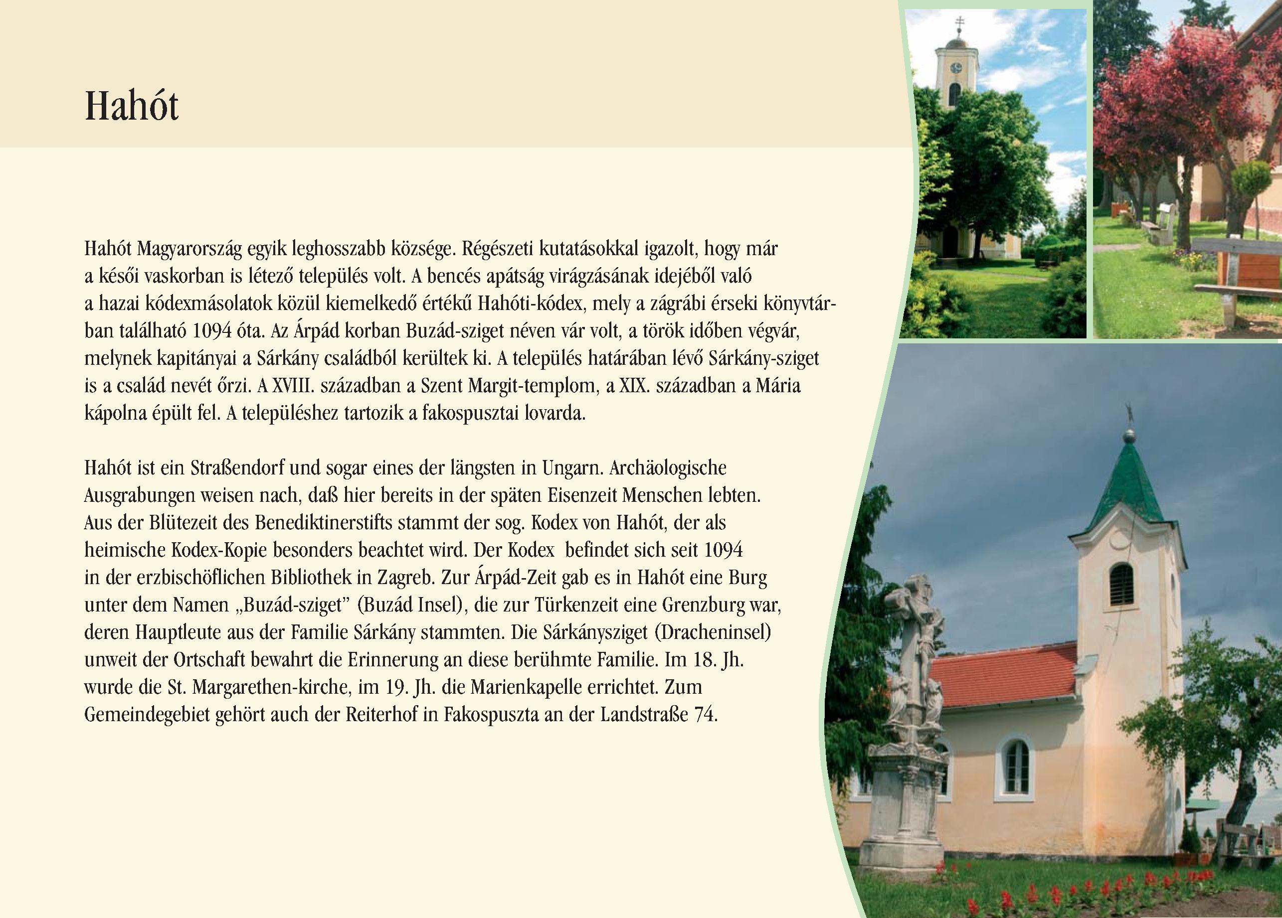 Nyilvános 2236 | 6702 | Hahót | Hahót ist ein Straßendorf und sogar eines der längsten in Ungarn. Archäologische Ausgrabungen weisen nach, daß hier bereits in der späten Eisenzeit Menschen lebten. Aus der Blütezeit des Benediktinerstifts stammt der sog. Kodex von Hahót, der als heimische Kodex-Kopie besonders beachtet wird. Der Kodex befindet sich seit 1094 in der erzbischöflichen Bibliothek in Zagreb. Zur Árpád-Zeit gab es in Hahót eine Burg unter dem Namen ,,Buzád-sziget" (Buzád Insel), die zur Türkenzeit eine Grenzburg war, deren Hauptleute aus der Familie Sárkány stammten. Die Sárkánysziget (Dracheninsel) unweit der Ortschaft bewahrt die Erinnerung an diese berühmte Familie. Im 18. Jh. wurde die St. Margarethen-kirche, im 19. Jh. die Marienkapelle errichtet. Zum Gemeindegebiet gehört auch der Reiterhof in Fakospuszta an der Landstraße 74. Dieses Text stammt von: Pannonhát tájpark prospektus 2006. Web: http://www.pannonhat.hu/ (auch in Deutsch) |
