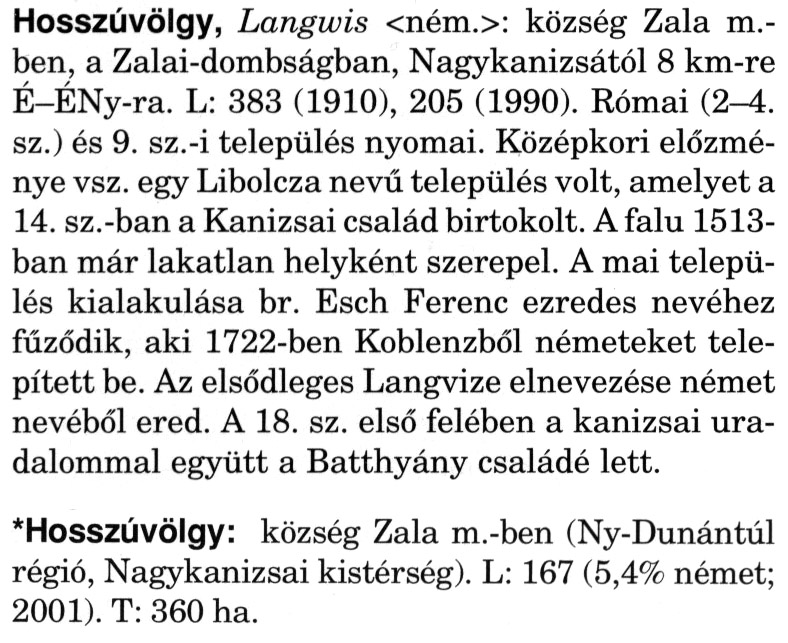 Nyilvános 2036 | 5708 | A szócikkek felismertetett szövege: | (A csillag után a kiegészítő kötetből származó szöveg következik) Hosszúvölgy, Langwis <ném.>: község Zala m.-ben, a Zalai-dombságban, Nagykanizsától 8 km-re É-ÉNy-ra. L: 383 (1910), 205 (1990). Római (2-4. sz.) és 9. sz.-i település nyomai. Középkori előzménye vsz. egy Libolcza nevű település volt, amelyet a 14. sz.-ban a Kanizsai család birtokolt. A falu 1513-ban már lakatlan helyként szerepel. A mai település kialakulása br. Esch Ferenc ezredes nevéhez fűződik, aki 1722-ben Koblenzből németeket telepített be. Az elsődleges Langvize elnevezése német nevéből ered. A 18. sz. első felében a kanizsai uradalommal együtt a Batthyány családé lett. *Hosszúvölgy: község Zala m.-ben (Ny-Dunántúl régió, Nagykanizsai kistérség). L: 167 (5,4% német; 2001). T: 360 ha. A szócikkek a következő lexikonból származnak: Cím: Magyar nagylexikon Közreműködő: Élesztős László (1949) (szerk.) ; Barabás Éva (1943) (szerk.) ; Berényi Gábor (1946) (szerk.) ; Bárány Lászlóné (szerk.) ; Adelmann-né Kertész Judit (1945) (közrem.) ; Froemel Károlyné Jáky Éva (1936) (közrem.) ; Akadémiai Kiadó és Nyomda Vállala Szerz. közl.: [... Élesztős László főszerk.] ; [szerk. Barabás Éva et al.] ; [bibliogr. Adelmanné Kertész Judit] ; [kész. az Akadémiai Kiadó Magyar Nagylexikon Szerkesztőségében] Kiadás: Budapest : Akad. K., 1993- Kötetei: 1. köt., A - Anc 2. köt., And - Bag 3. köt., Bah - Bij 4. köt., Bik - Bz 5. köt., C - Csem 6. köt., Csen - Ec 7. köt., Ed - Fe 8. köt., Ff - Gyep 9. köt., Gyer - Iq 10. köt., Ir - Kip 11. köt., Kir - Lem 12. köt., Len - Mep 13. köt., Mer - Nyk 14. köt., Nyl - Pom 15. köt., Pon - Sek 16. köt., Sel - Szö 17. köt., Szp - Ung 18. köt., Unh - Z 19. köt., Kiegészítő kötet, A - Z ETO jelzet: 030=945.11 Szakjelzet: 030 Cutter: M 14 ISBN: 963-05-6611-7 [!ISBN 963-05-6615-X] Nyelv: magyar Megjegyzés: Az 5. kötettől kiad. a Magyar Nagylexikon Kiadó ; A 6. kötettől főszerk. Berényi Gábor ; A 6. kötettől szakszerk. Bárány Lászlóné et al. ; A 6. kötettől bibliogr. Froemel Károlyné ; Bibliogr. a szócikkek végén |