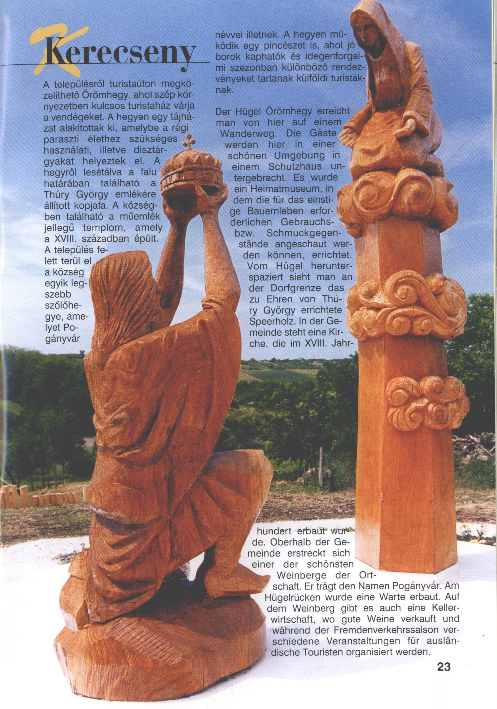 Nyilvános 2170 | 5893 | Kerecseny | Der Hügel Örömhegy erreicht man von hier auf einem Wanderweg. Die Gäste werden hier in einer schönen Umgebung in einem Schutzhaus untergebracht. Es wurde ein Heimatmuseum, in dem die für das einstige Bauernleben erforderlichen Gebrauchs bzw. Schmuckgegenstände angeschaut werden können, errichtet. Vom Hügel herunterspaziert sieht man an der Dorfgrenze das zu Ehren von Thúry György errichtete Speerholz. In der Gemeinde steht eine Kirche, die im XVIII. Jahrhundert erbaut wurde. Oberhalb der Gemeinde erstreckt sich einer der schönsten Weinberge der Ortschaft. Er trägt den Namen Pogányvár. Am Hügelrücken wurde eine Warte erbaut. Auf dem Weinberg gibt es auch eine Kellerwirtschaft, wo gute Weine verkauft und während der Fremdenverkehrssaison verschiedene Veranstaltungen für ausländische Touristen organisiert werden. Dieses Text stammt von: Titel: Hívogató a Régiók Kapujában - Útikönyv Látnivalók Nagykanizsán és Térségében (Einladend in dem Tor des Gebiets - Reisebuch - Sehenswürdigkeiten in Nagykanizsa und Umgebung) Herausgegeben von: Nagykanizsa és a Környező Települések Területfejlesztési Társulása (Verein für Gebietsentwicklung in Nagykanizsa und in ihrer Umgebung) 8800 Nagykanizsa, Petőfi Sándor út 5. Tel.: 06 93/536-453 • 06 93/536-454 Tel ./Fax: 06 93/326-323 E-mail: terstars@axelero.hu www.kanizsaterseg.celodin.hu |