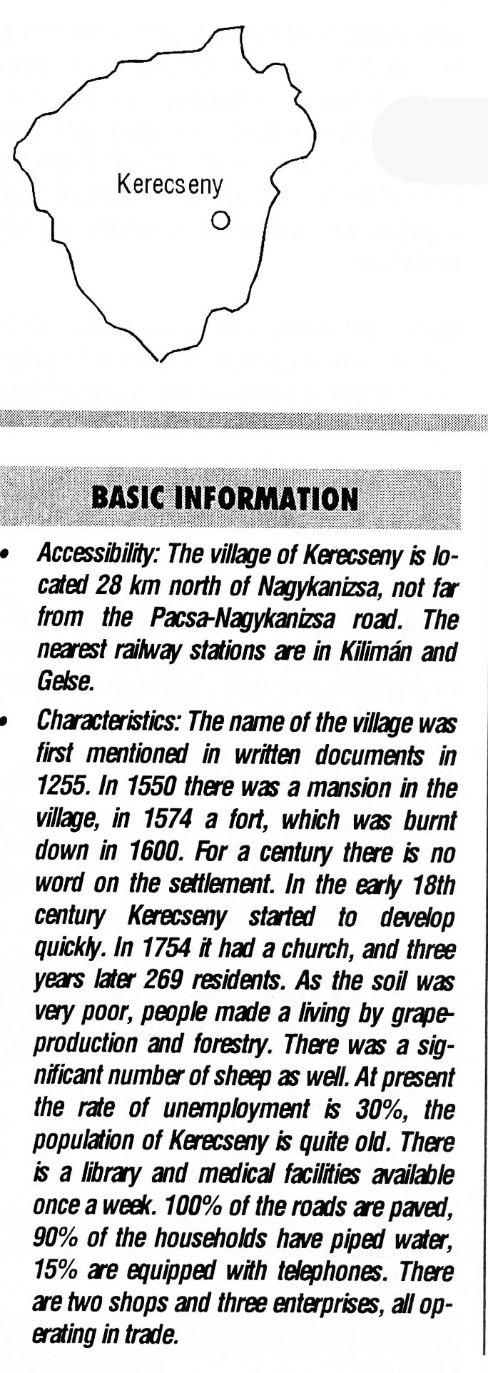 Nyilvános 2145 | 6150 | Kerecseny | BASIC INFORMATION Accessibility: The village of Kerecseny is located 28 km north of Nagykanizsa, not far from the Pacsa-Nagykanizsa road. The nearest railway stations are in Kilimán and Gelse. Characteristics: The name of the village was first mentioned in written documents in 1255. In 1550 there was a mansion in the village, in 1574 a fort, which was burnt down in 1600. For a century there is no word on the settlement. In the early 18th century Kerecseny started to develop quickly. In 1754 it had a church, and three years later 269 residents. As the soil was very poor, people made a living by grape-production and forestry. There was a significant number of sheep as well. At present the rate of unemployment is 30%, the population of Kerecseny is quite old. There is a library and medical facilities available once a week. 100% of the roads are paved, 90% of the households have piped water, 15% are equipped with telephones. There are two shops and three enterprises, all operating in trade. This text came from the following book: Title: Handbook of Zala county (Zala megye kézikönyve) Series: County handbooks of Hungary (Magyarország megyei kézikönyvei) Chief editor: Hóbor József Publisher: (Hatvan), CEBA-Hungary Ltd, 1998 ETO: 908.439.121(035) ; 050.8(439.121) ISBN: 963-9089-18-2 Pages: 488-1040 p. Remark: Closed on: 1998. márc. 31. |