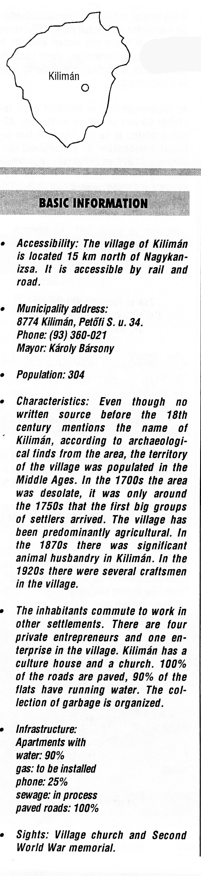 Nyilvános 2130 | 5871 | Kilimán | BASIC INFORMATION Accessibility: The village of Kilimán is located 15 km north of Nagykanizsa. It is accessible by rail and road. Municipality address: 8774 Kilimán, Petőfi S. u. 34. Phone: (93) 360-021 Mayor: Károly Bársony Population: 304 Characteristics: Even though no written source before the 18th century mentions the name of Kilimán, according to archaeological finds from the area, the territory of the village was populated in the Middle Ages. In the 1700s the area was desolate, it was only around the 1750s that the first big groups of settlers arrived. The village has been predominantly agricultural. In the 1870s there was significant animal husbandry in Kilimán. In the 1920s there were several craftsmen in the village. The inhabitants commute to work in other settlements. There are four private entrepreneurs and one enterprise in the village. Kilimán has a culture house and a church. 100% of the roads are paved, 90% of the flats have running water. The collection of garbage is organized. Infrastructure: Apartments with water: 90% gas: to be installed phone: 25% sewage: in process paved roads: 100% Sights: Village church and Second World War memorial. This text came from the following book: Title: Handbook of Zala county (Zala megye kézikönyve) Series: County handbooks of Hungary (Magyarország megyei kézikönyvei) Chief editor: Hóbor József Publisher: (Hatvan), CEBA-Hungary Ltd, 1998 ETO: 908.439.121(035) ; 050.8(439.121) ISBN: 963-9089-18-2 Pages: 488-1040 p. Remark: Closed on: 1998. márc. 31. |