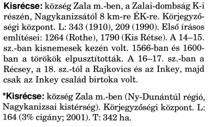 Nyilvános 2133 | 5827 | Rövid leírás | Teljes leírás (2.25 KB) | A szócikkek felismertetett szövege: (A csillag után a kiegészítő kötetből származó szöveg következik) Kisrécse: község Zala m.-ben, a Zalai-dombság K-i részén, Nagykanizsától 8 km-re ÉK-re. Körjegyzőségi központ. L: 343 (1910), 209 (1990). Első írásos említései: 1264 (Rothe), 1790 (Kis Rétse). A 14-15. sz.-ban kisnemesek kezén volt. 1566-ban és 1600-ban a törökök elpusztították. A 16—17. sz.-ban a Récsey, a 18. sz.-tól a Rajkovics és az Inkey, majd csak az Inkey család birtoka volt. *Kisrécse: község Zala m.-ben (Ny-Dunántúl régió, Nagykanizsai kistérség). Körjegyzőségi központ. L: 164 (3% cigány; 2001). T: 342 ha. A szócikkek a következő lexikonból származnak: Cím: Magyar nagylexikon Közreműködő: Élesztős László (1949) (szerk.) ; Barabás Éva (1943) (szerk.) ; Berényi Gábor (1946) (szerk.) ; Bárány Lászlóné (szerk.) ; Adelmann-né Kertész Judit (1945) (közrem.) ; Froemel Károlyné Jáky Éva (1936) (közrem.) ; Akadémiai Kiadó és Nyomda Vállala Szerz. közl.: [... Élesztős László főszerk.] ; [szerk. Barabás Éva et al.] ; [bibliogr. Adelmanné Kertész Judit] ; [kész. az Akadémiai Kiadó Magyar Nagylexikon Szerkesztőségében] Kiadás: Budapest : Akad. K., 1993- Kötetei: 1. köt., A - Anc 2. köt., And - Bag 3. köt., Bah - Bij 4. köt., Bik - Bz 5. köt., C - Csem 6. köt., Csen - Ec 7. köt., Ed - Fe 8. köt., Ff - Gyep 9. köt., Gyer - Iq 10. köt., Ir - Kip 11. köt., Kir - Lem 12. köt., Len - Mep 13. köt., Mer - Nyk 14. köt., Nyl - Pom 15. köt., Pon - Sek 16. köt., Sel - Szö 17. köt., Szp - Ung 18. köt., Unh - Z 19. köt., Kiegészítő kötet, A - Z ETO jelzet: 030=945.11 Szakjelzet: 030 Cutter: M 14 ISBN: 963-05-6611-7 [!ISBN 963-05-6615-X] Nyelv: magyar Megjegyzés: Az 5. kötettől kiad. a Magyar Nagylexikon Kiadó ; A 6. kötettől főszerk. Berényi Gábor ; A 6. kötettől szakszerk. Bárány Lászlóné et al. ; A 6. kötettől bibliogr. Froemel Károlyné ; Bibliogr. a szócikkek végén |