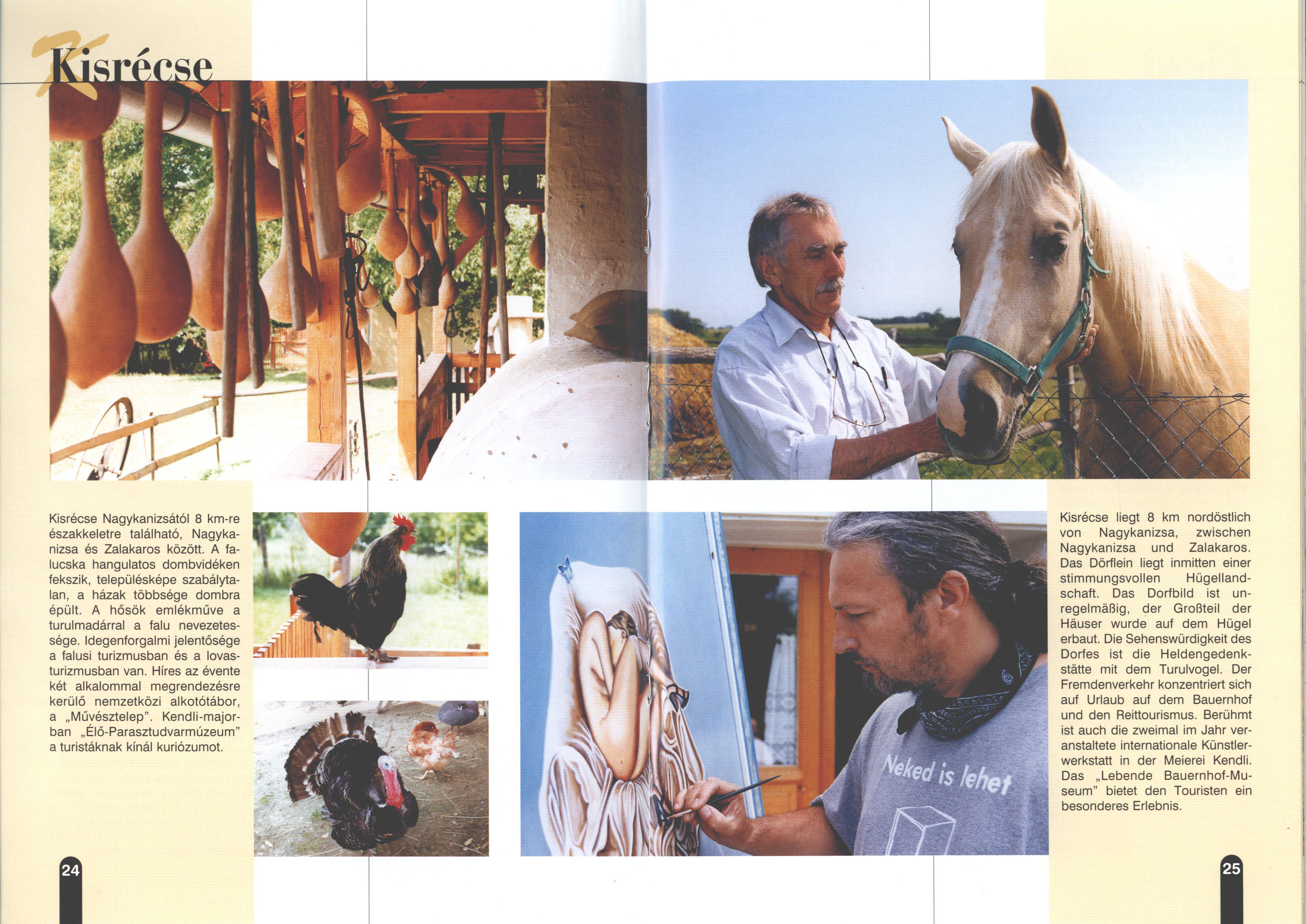 Nyilvános 2180 | 7691 | Kisrécse | Kisrécse Nagykanizsától 8 km-re északkeletre található, Nagykanizsa és Zalakaros között. A falucska hangulatos dombvidéken fekszik, településképe szabálytalan, a házak többsége dombra épült. A hősök emlékműve a turulmadárral a falu nevezetessége. Idegenforgalmi jelentősége a falusi turizmusban és a lovasturizmusban van. Híres az évente két alkalommal megrendezésre kerülő nemzetközi alkotótábor, a „Művésztelep". Kendli-majorban „Élő-Parasztudvarmúzeum" a turistáknak kínál kuriózumot. Kisrécse liegt 8 km nordöstlich von Nagykanizsa, zwischen Nagykanizsa und Zalakaros. Das Dörflein liegt inmitten einer stimmungsvollen Hügellandschaft. Das Dorfbild ist unregelmäßig, der Großteil der Häuser wurde auf dem Hügel erbaut. Die Sehenswürdigkeit des Dorfes ist die Heldengedenkstätte mit dem Turulvogel. Der Fremdenverkehr konzentriert sich auf Urlaub auf dem Bauernhof und den Reittourismus. Berühmt ist auch die zweimal im Jahr veranstaltete internationale Künstlerwerkstatt in der Meierei Kendli. Das „Lebende Bauernhof-Museum" bietet den Touristen ein besonderes Erlebnis. Dieses Text stammt von: Titel: Hívogató a Régiók Kapujában - Útikönyv Látnivalók Nagykanizsán és Térségében (Einladend in dem Tor des Gebiets - Reisebuch - Sehenswürdigkeiten in Nagykanizsa und Umgebung) Herausgegeben von: Nagykanizsa és a Környező Települések Területfejlesztési Társulása (Verein für Gebietsentwicklung in Nagykanizsa und in ihrer Umgebung) 8800 Nagykanizsa, Petőfi Sándor út 5. Tel.: 06 93/536-453 • 06 93/536-454 Tel ./Fax: 06 93/326-323 E-mail: terstars@axelero.hu www.kanizsaterseg.celodin.hu |