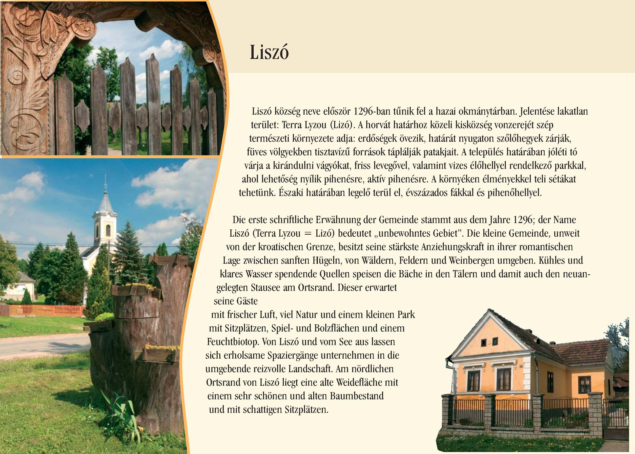 Nyilvános 2507 | 7896 | Liszó | Die erste schriftliche Erwähnung der Gemeinde stammt aus dem Jahre 1296; der Name Liszó (Terra Lyzou = Lizó) bedeutet ,,unbewohntes Gebiet". Die kleine Gemeinde, unweit von der kroatischen Grenze, besitzt seine stärkste Anziehungskraft in ihrer romantischen Lage zwischen sanften Hügeln, von Wäldern, Feldern und Weinbergen umgeben. Kühles und klares Wasser spendende Quellen speisen die Bäche in den Tälern und damit auch den neuangelegten Stausee am Ortsrand. Dieser erwartet seine Gäste mit frischer Luft, viel Natur und einem kleinen Park mit Sitzplätzen, Spiel- und Bolzflächen und einem Feuchtbiotop. Von Liszó und vom See aus lassen sich erholsame Spaziergänge unternehmen in die umgebende reizvolle Landschaft. Am nördlichen Ortsrand von Liszó liegt eine alte Weidefläche mit einem sehr schönen und alten Baumbestand und mit schattigen Sitzplätzen. Dieses Text stammt von: Pannonhát tájpark prospektus 2006. Web: http://www.pannonhat.hu/ (auch in Deutsch) |
